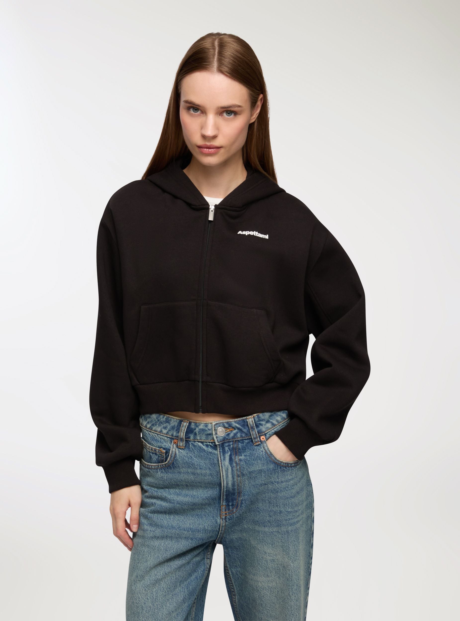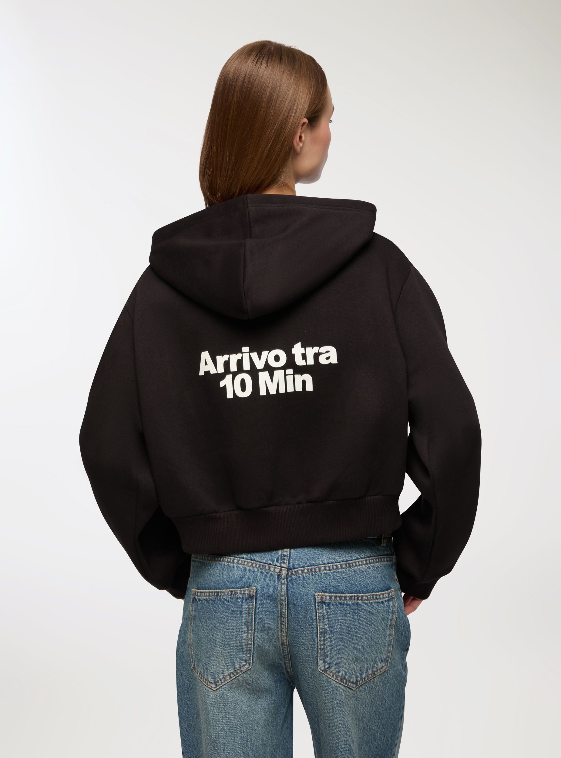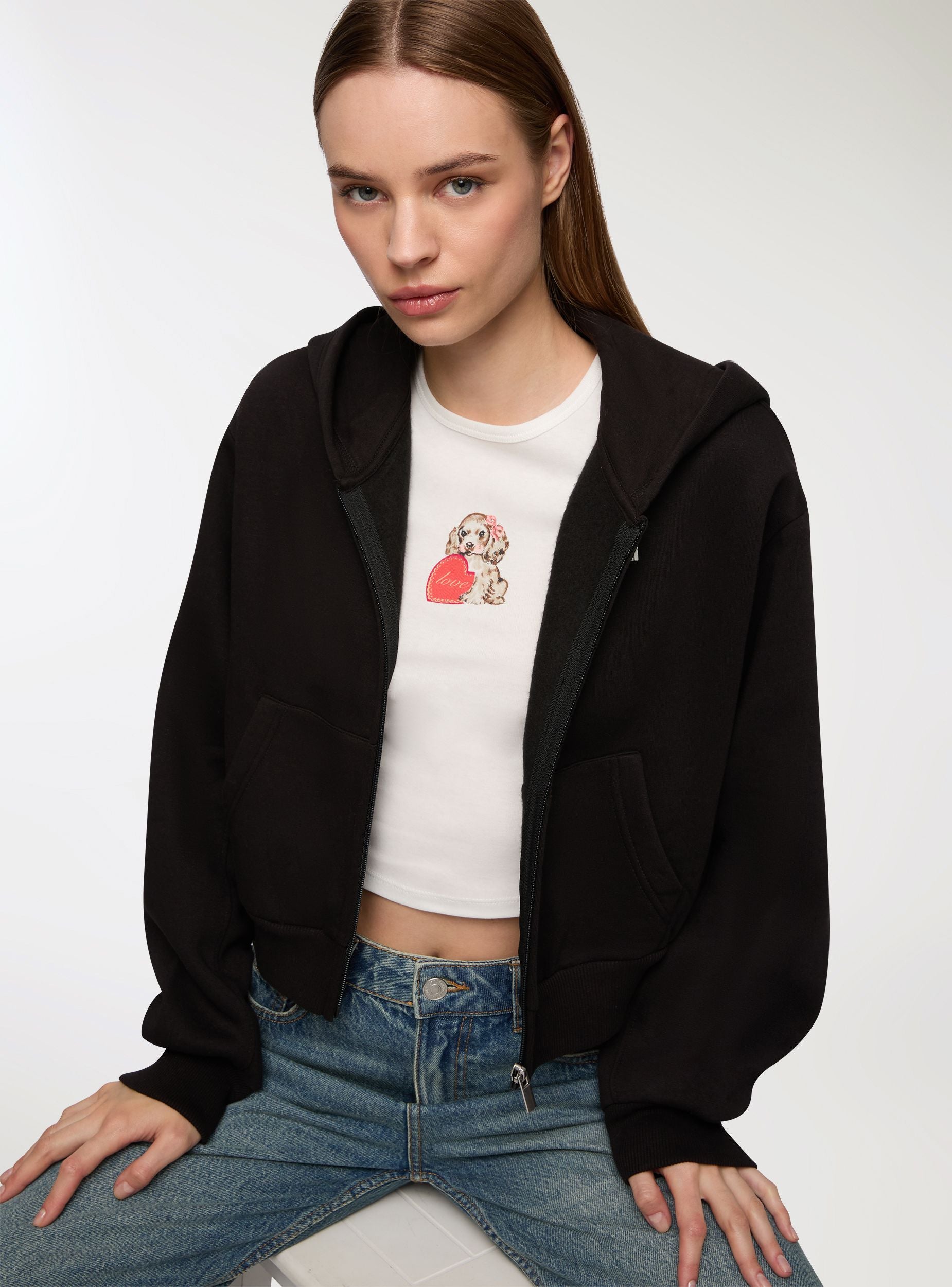 Sudadera pesada de mujer con cremallera frontal, capucha e impresión irónica en la parte delantera y trasera. El corte crop brinda comodidad y un estilo moderno. Fabricada en tejido de felpa, es perfecta para los meses fríos. Ideal para looks casuales y atrevidos, se puede combinar con jeans o joggers para un look urbano, relajado y lleno de personalidad.Detalles