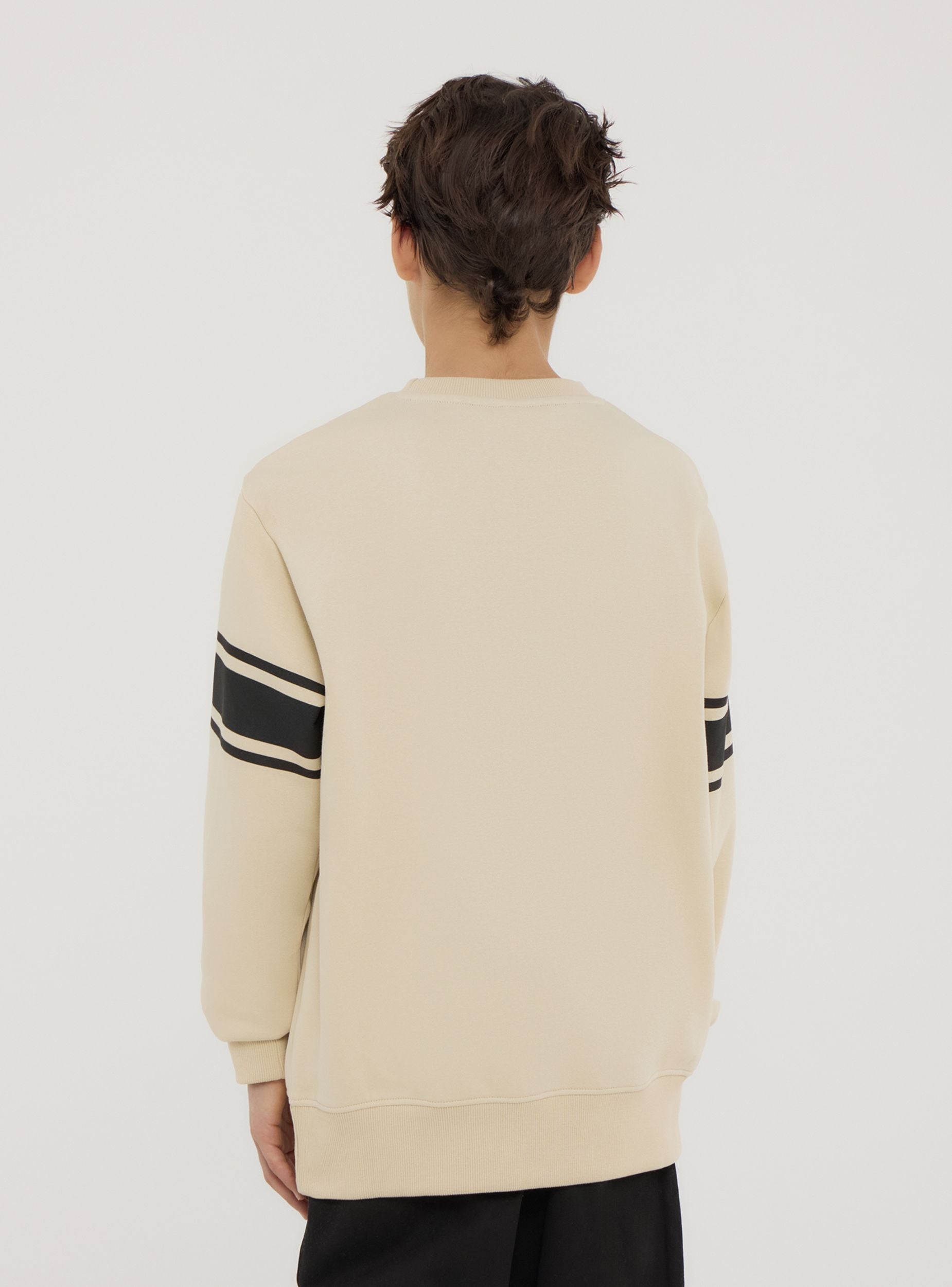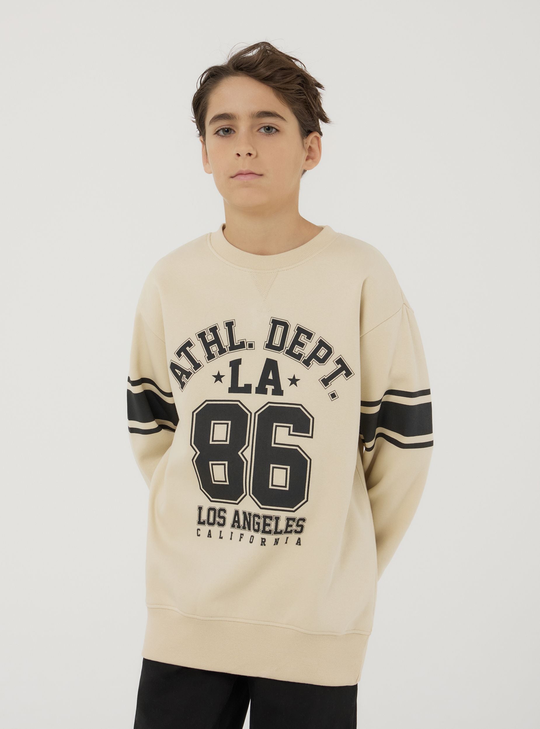 Sudadera ligera para niño de manga larga con cuello redondo, caracterizada por una impresión de estilo deportivo con número y detalles gráficos que evocan la ropa de universidad. Las bandas en las mangas añaden un toque dinámico y a la moda. Perfecta para looks casuales y diarios, se combina fácilmente con jeans o joggers y zapatillas, ideal para la escuela, el tiempo libre o actividades al aire libre.Detalles