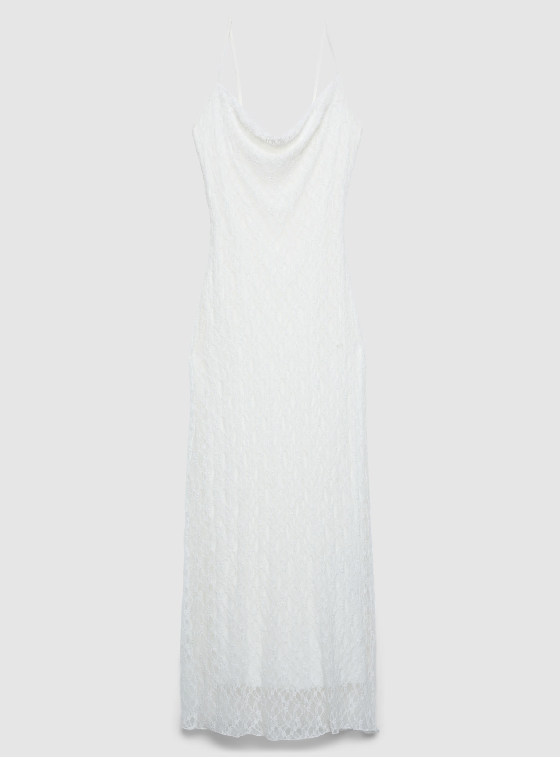 Vestido largo de mujer en encaje de color liso, pensado para ceremonias y noches especiales. La línea realza la silueta y el escote suave aporta un toque elegante. El modelo es sin mangas, con tirantes finos ajustables y bajo acabado. Perfecto con sandalias minimalistas y blazer, o con zapatos de salón y clutch para un look más sofisticado.Detalles
