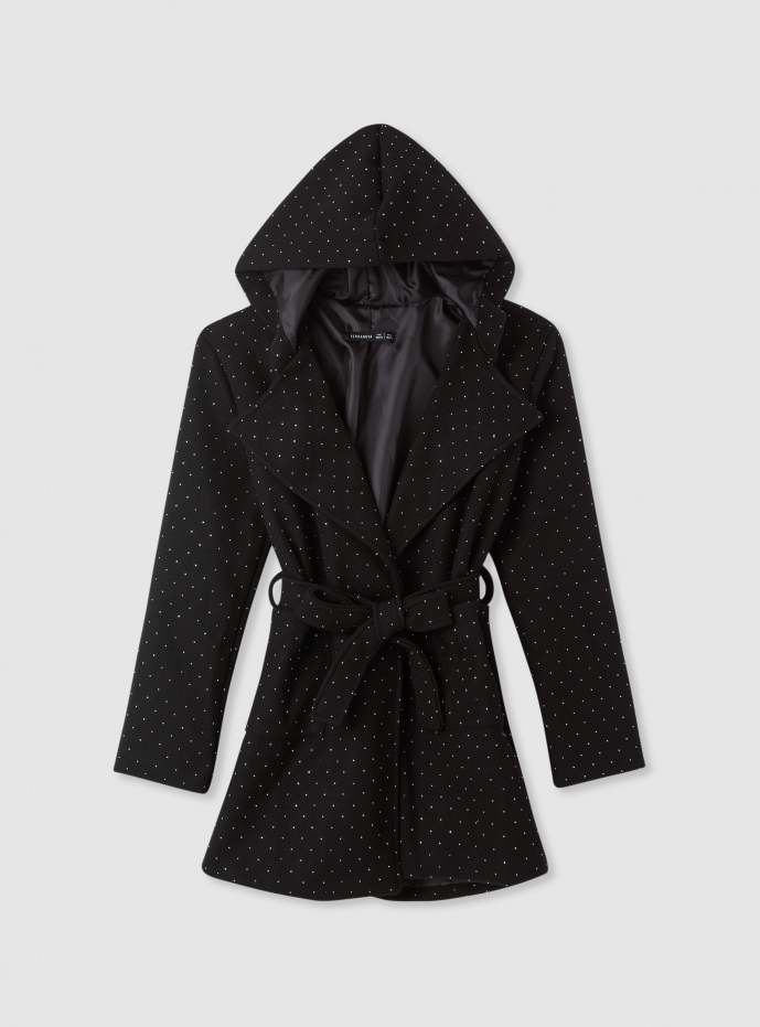 Abrigo para niña con capucha, perfecto para los meses fríos y las salidas por la ciudad. Modelo con estampado de lunares por todo el abrigo, equipado con cinturón en la cintura para anudar y definir el ajuste. Presenta cuello con solapas, mangas largas y bolsillos frontales aplicados. Largo medio ideal para combinar con vaqueros o leggings, fácil de combinar también con looks para la escuela o el fin de semana.