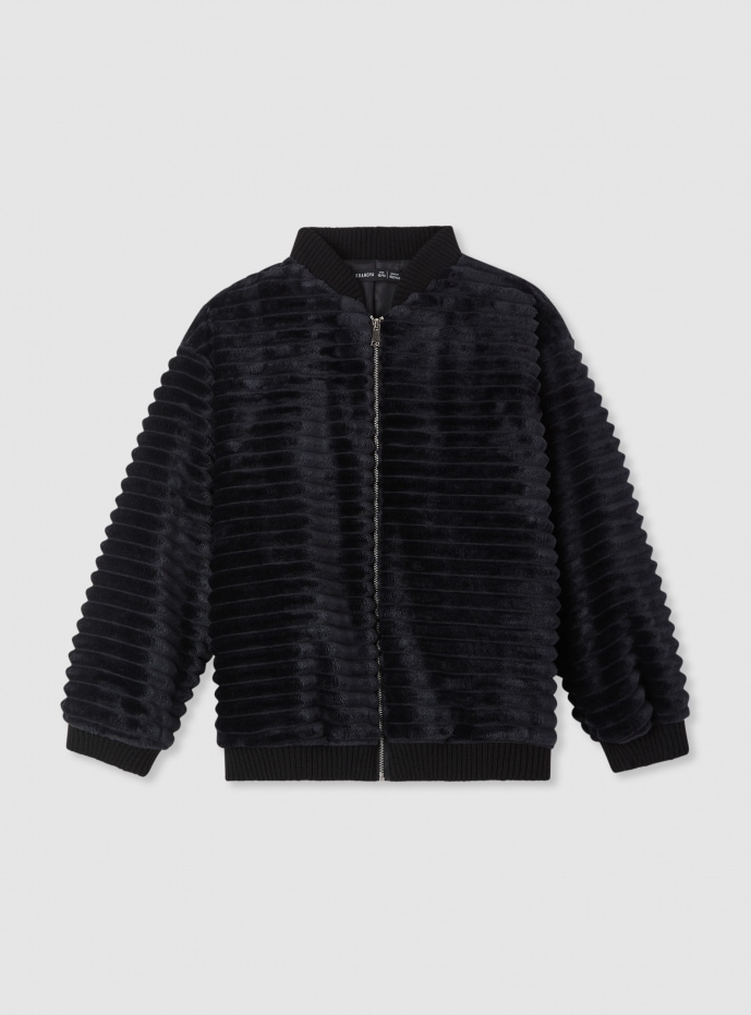 Chaqueta bomber para niña, perfecta para media estación y tiempo libre. Confeccionada en tejido efecto pelo con un acabado de costillas horizontales. Presenta cuello, puños y bajo en punto de canalé, cierre frontal con cremallera. Corte regular que permite superponerla sobre sudaderas o camisetas. Ideal con vaqueros y zapatillas para un look urbano suave y cómodo, en color liso.