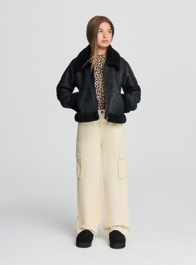 Chaqueta biker para niña con efecto borrego, caracterizada por un cierre frontal con cremallera y un cuello amplio. Las mangas largas y el corte regular garantizan un ajuste cómodo. Presenta detalles en color liso y bordes acabados, ideal para completar conjuntos casuales con un toque moderno y versátil, adecuado para diversas ocasiones informales.