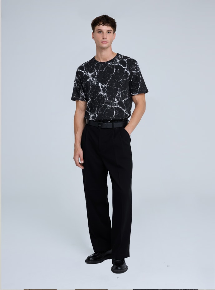Camiseta de hombre con estampado efecto mármol, ideal para un look casual y moderno. Presenta un corte holgado y mangas cortas, perfecta para combinar con vaqueros o pantalones deportivos. El diseño único del estampado añade un toque distintivo, haciéndola adecuada para ocasiones informales o para expresar un estilo personal.