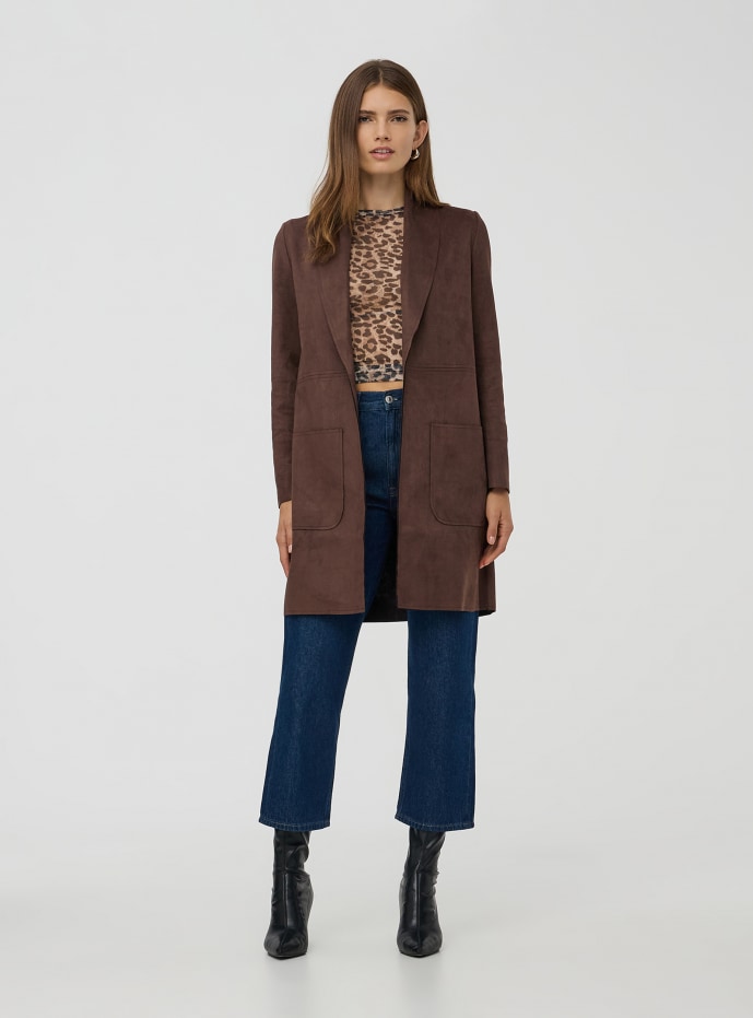 Abrigo de mujer con efecto de ante, caracterizado por una textura suave y aterciopelada que recuerda la apariencia del ante. Esta prenda tiene una línea larga y fluida, con un corte ligeramente acampanado que confiere movimiento y gracia a la figura. Perfecto para un look casual pero refinado. Perfecto para la media temporada o para añadir una capa ligera y estilosa.