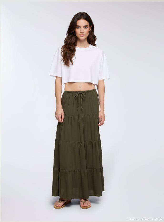 Falda larga de mujer lisa con volantes, ideal para un look casual y versátil. La cintura elástica con cordón garantiza un ajuste cómodo y regulable. Perfecta para combinar con camisetas o camisas, es adecuada para múltiples ocasiones, desde el tiempo libre hasta eventos informales. El diseño con volantes añade movimiento y estilo a la prenda, convirtiéndola en un imprescindible para el armario.