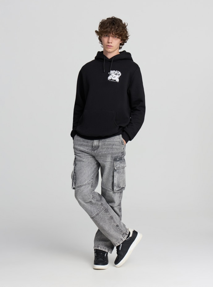 Sudadera pesada de hombre con capucha y cordón ajustable, ideal para afrontar la temporada invernal con estilo. Las mangas largas y el corte cómodo la hacen perfecta para el uso diario. En el frente, una pequeña impresión con un osito en estilo graffiti anticipa la amplia gráfica urbana situada en la parte posterior. Completa el diseño un práctico bolsillo canguro. Una prenda de carácter, pensada para quienes aman un estilo street contemporáneo.