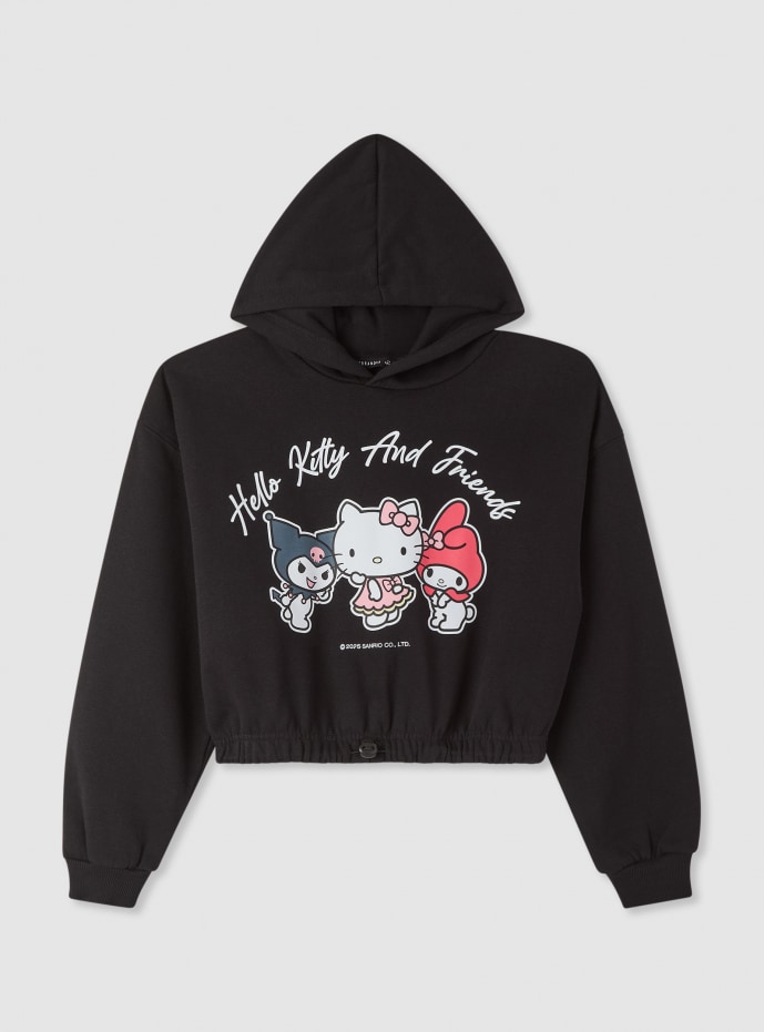 Sudadera para niña de manga larga. Modelo con capucha y sin cremallera, corte cropped y estampado de letras y personajes de Hello Kitty® en el delantero. Ideal para el tiempo libre y la escuela, combina con vaqueros o pantalones cortos para un look casual.