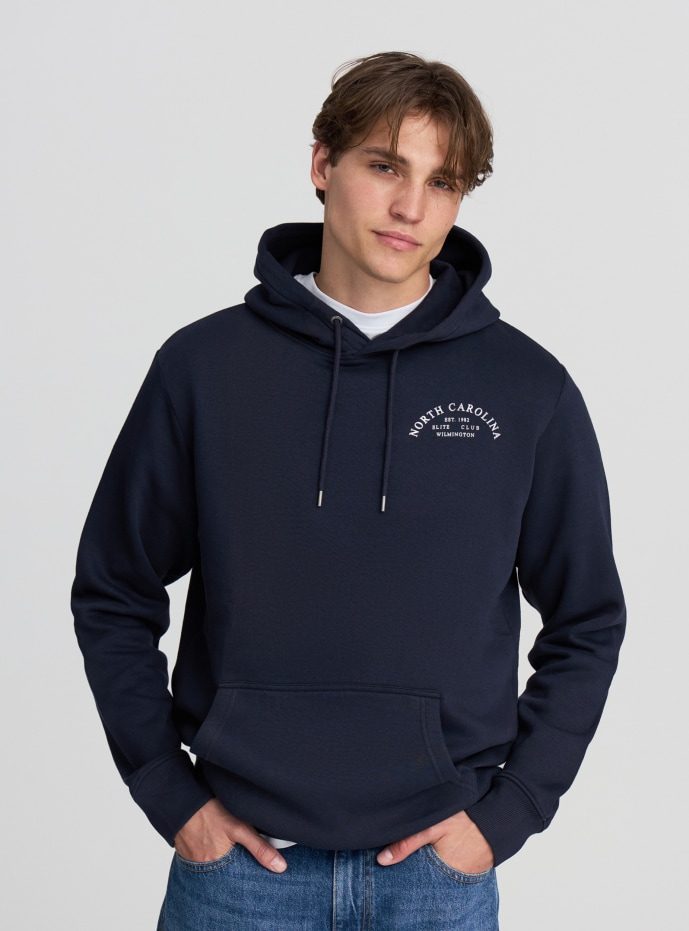 Sudadera pesada para hombre perfecta para la temporada fría, con capucha y cordón ajustable para mayor protección. El diseño presenta mangas largas, un cómodo bolsillo canguro y estampado frontal y trasero con letras de estilo universitario que evocan el universo deportivo americano. Fabricada en tejido suave, combina comodidad y estilo casual para acompañarte en tus looks diarios.