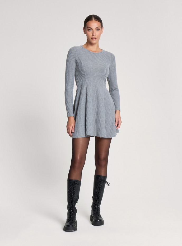 Vestido acampanado de mujer en punto de canalé, con cuello redondo y mangas largas. El diseño realza la silueta gracias a su forma que acompaña las curvas y se abre suavemente en el bajo. Perfecto para conjuntos femeninos y cómodos en las estaciones frías, ideal para combinar con botines o zapatillas para un estilo casual pero cuidado.