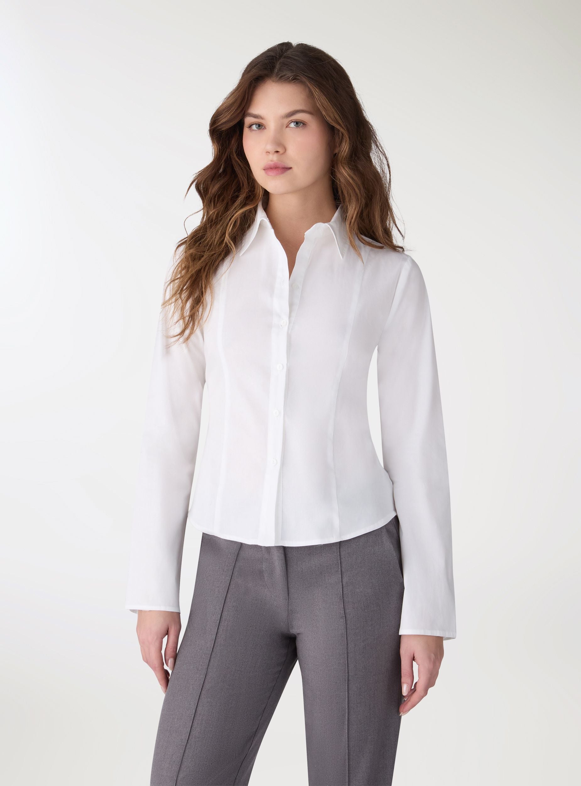 Chemise femme unie à coupe ajustée, idéale pour un look de bureau ou des occasions plus soignées. Le modèle présente un col pointu, des manches longues et une fermeture frontale à boutons. Lignes épurées et ourlet légèrement arrondi pour la porter rentrée dans un pantalon de tailleur ou avec un jean et un blazer.Détails