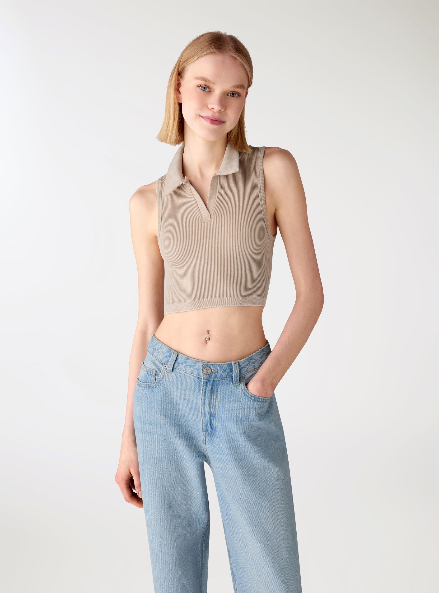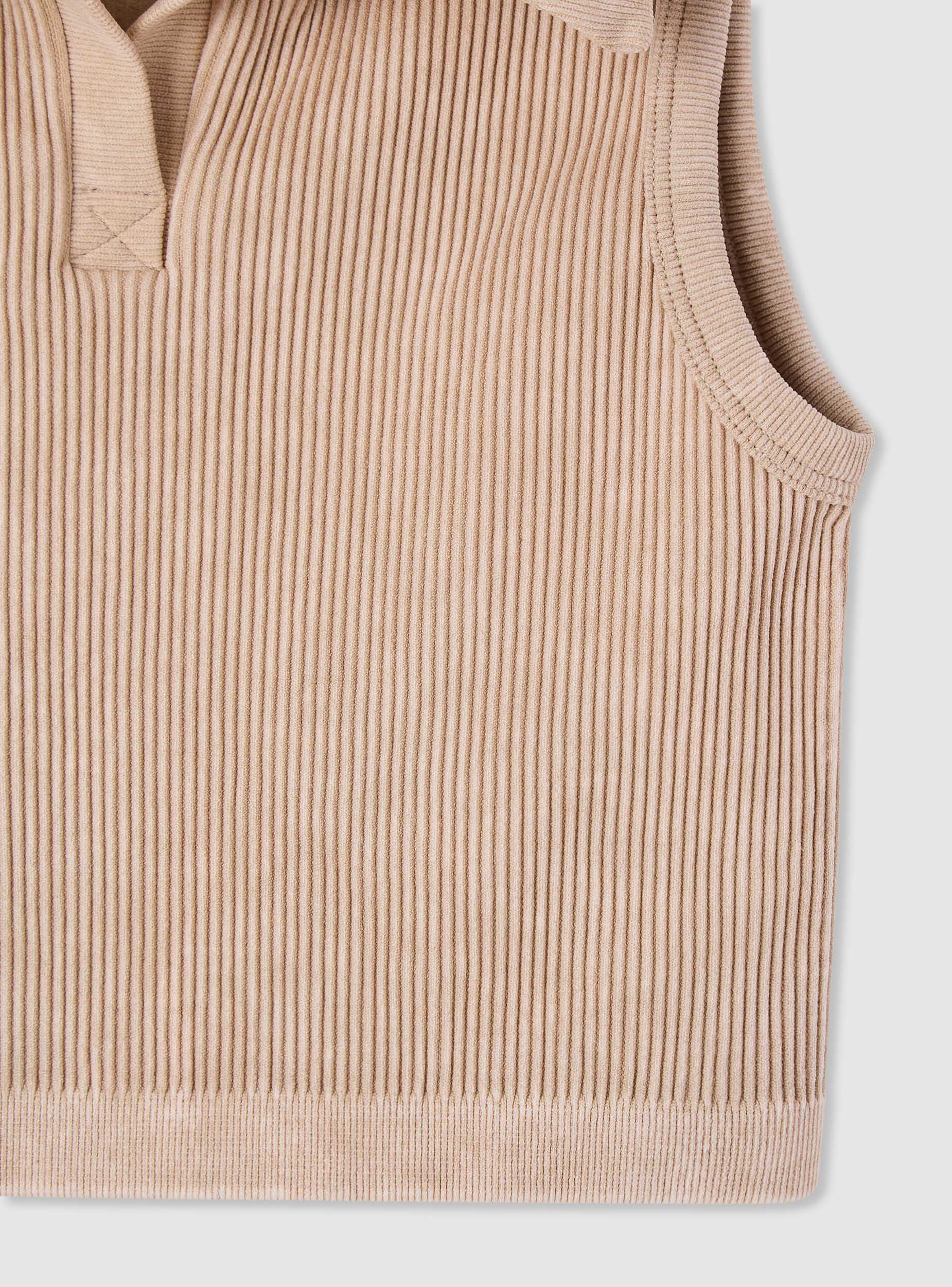 Débardeur femme uni au design contemporain, idéal pour un look urbain et décontracté. Modèle sans manches avec une structure côtelée et un col polo, agrémenté d’un décolleté en V sans boutons. La coupe épouse le buste et l’ourlet inférieur définit la silhouette. Parfait avec un jean, une jupe ou un pantalon cargo, à porter seul ou sous des vestes légères.Détails