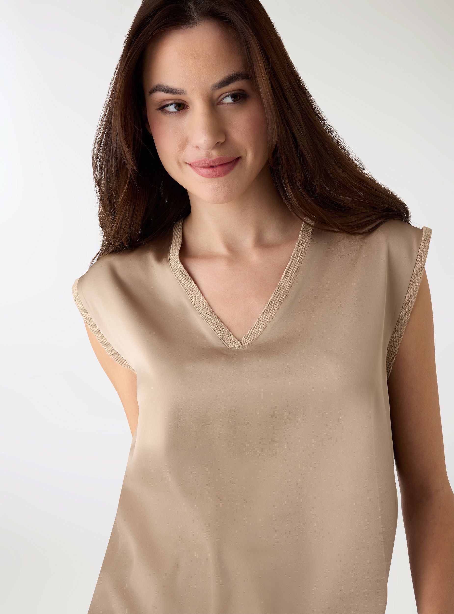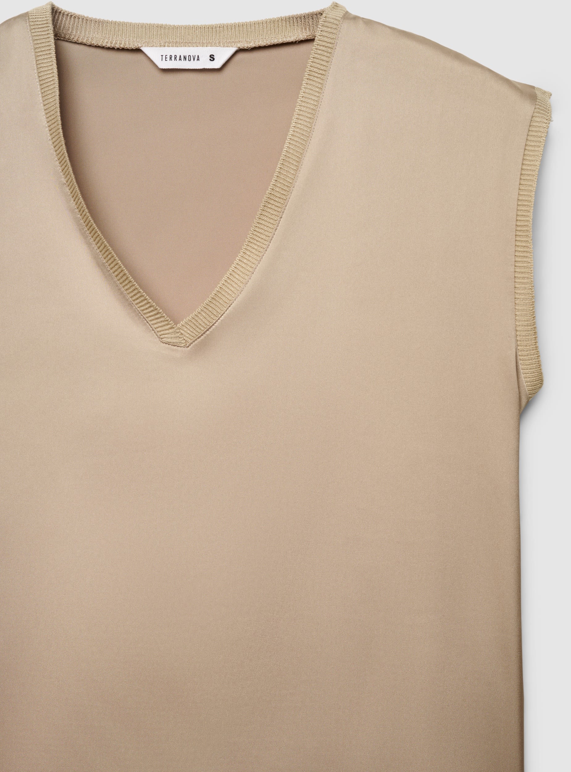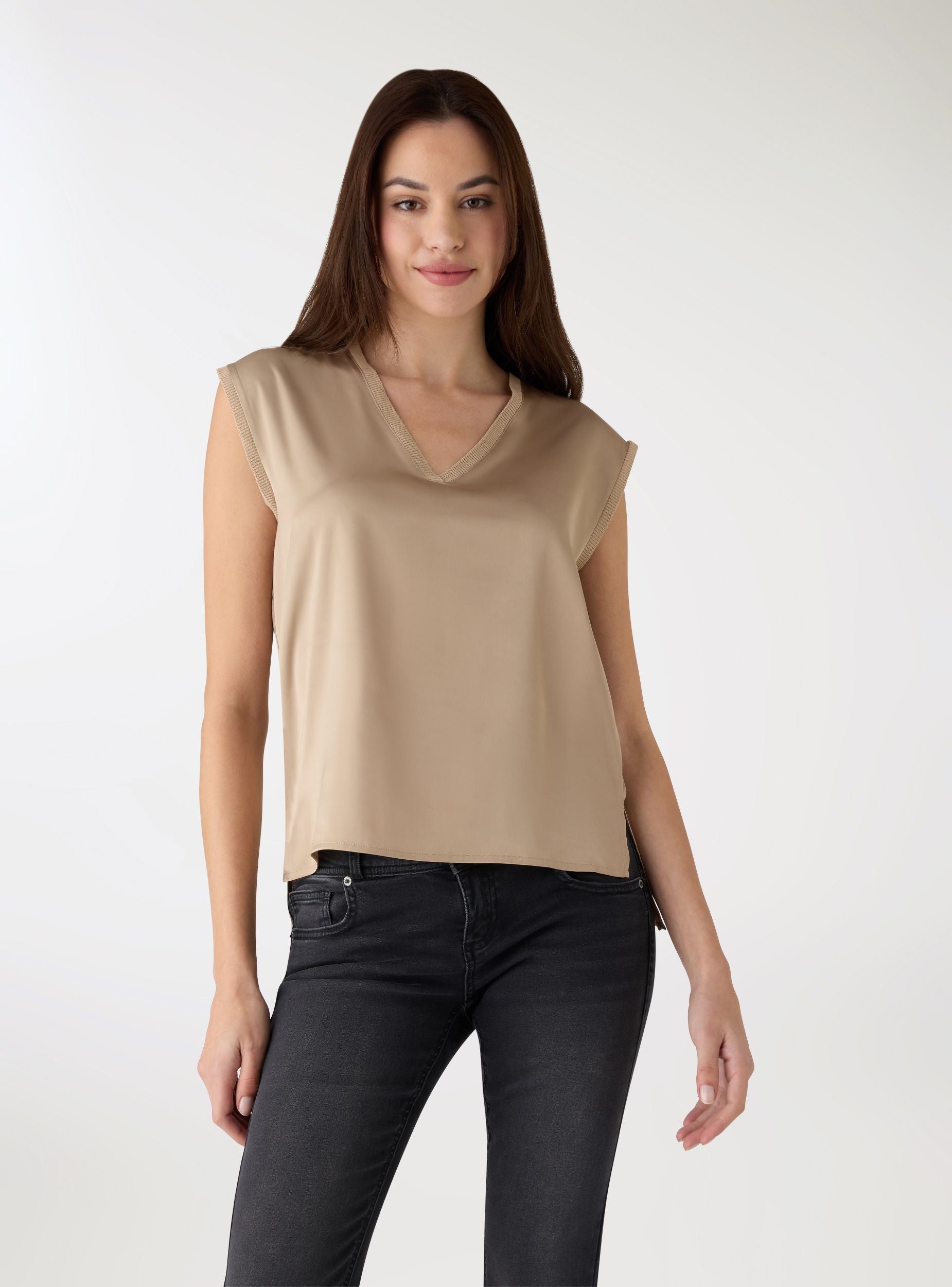 Top femme uni, sans manches, avec un col en V profond bordé de côtes. Coupe droite et longueur normale, idéal pour le bureau et les loisirs. Le design minimaliste facilite les associations avec des jeans, des jupes midi ou des pantalons élégants, tandis que l’ourlet légèrement doublé apporte une touche soignée. Parfait sous un blazer ou un cardigan pour des looks polyvalents et féminins.Détails