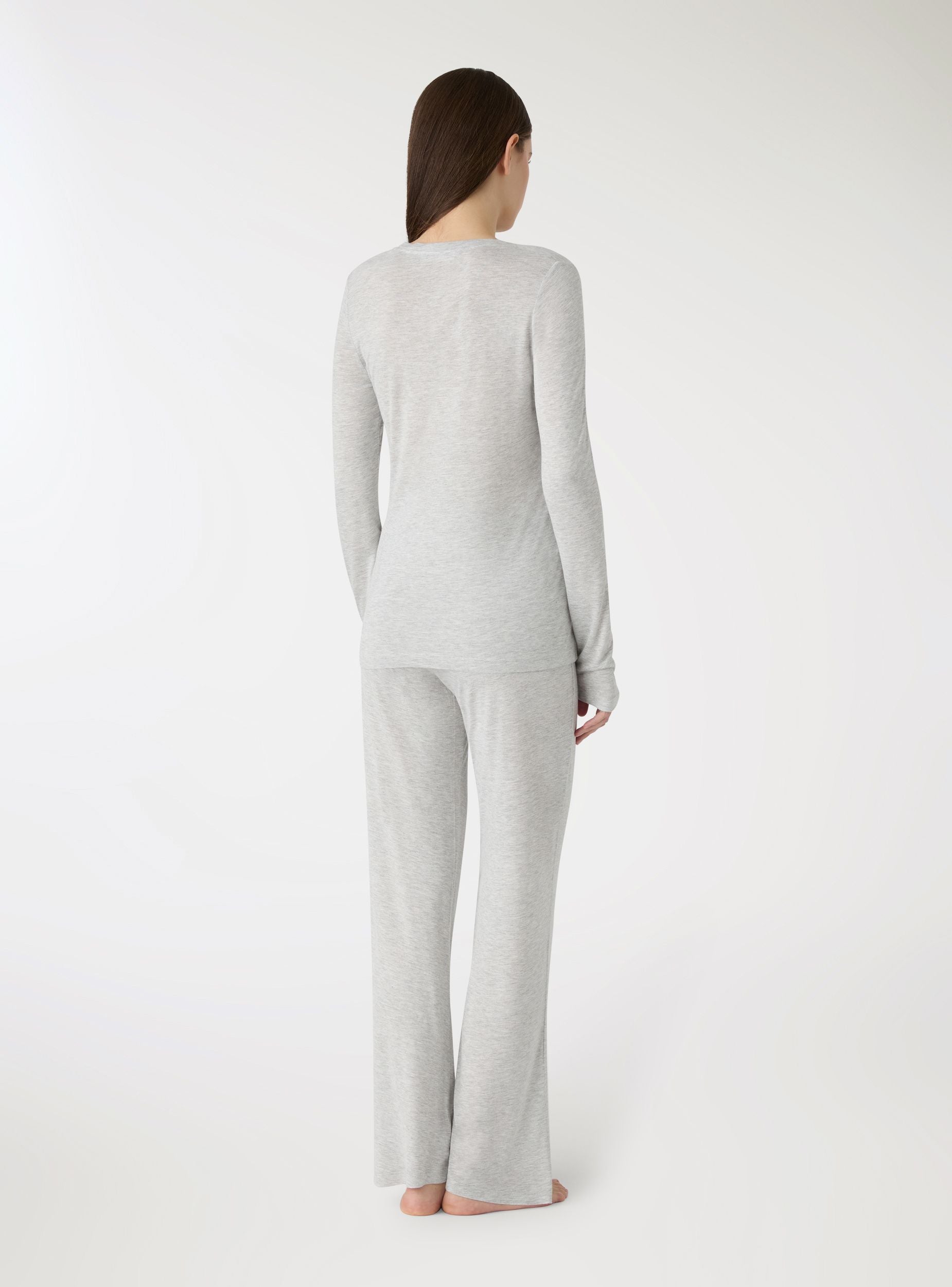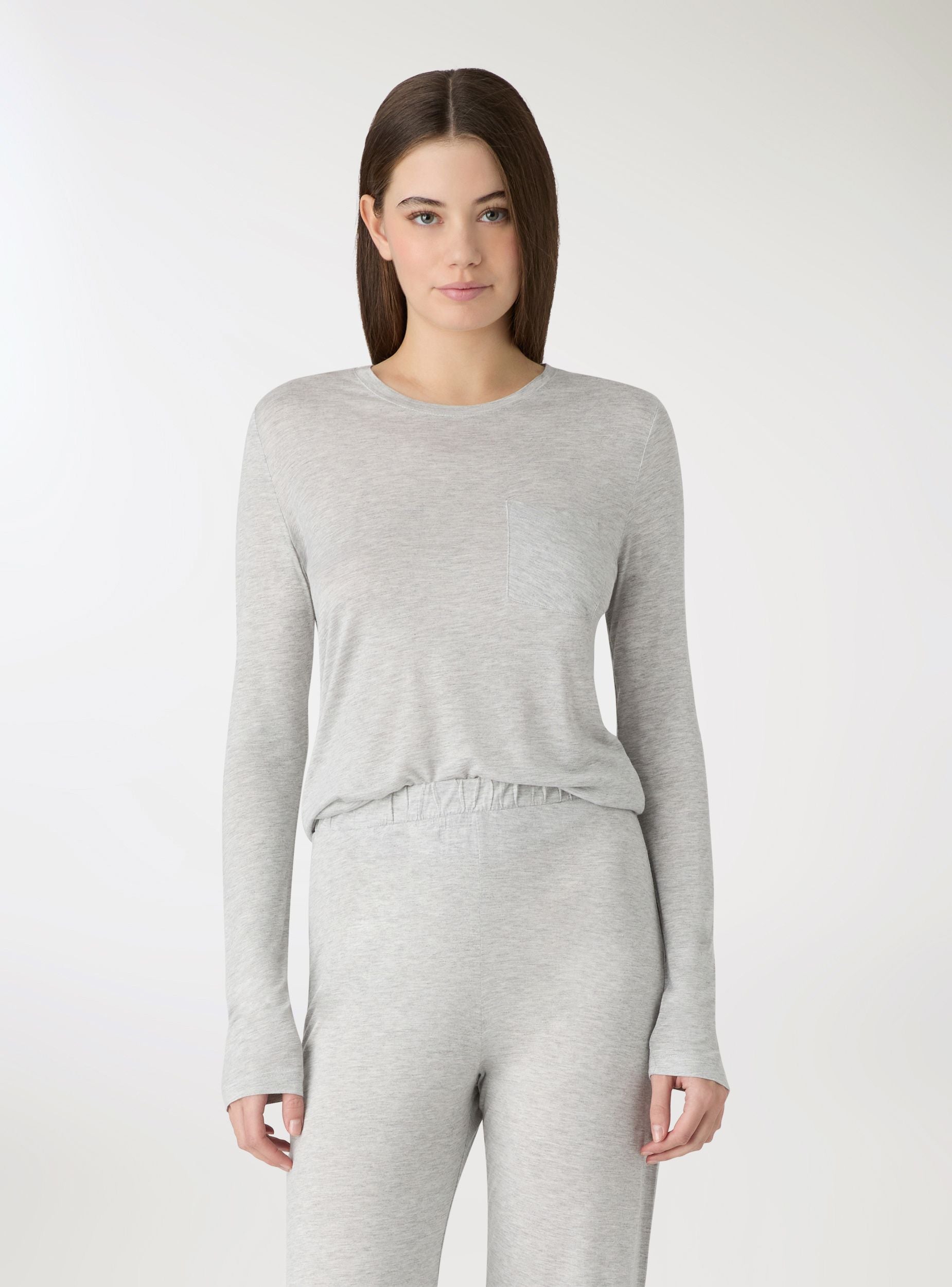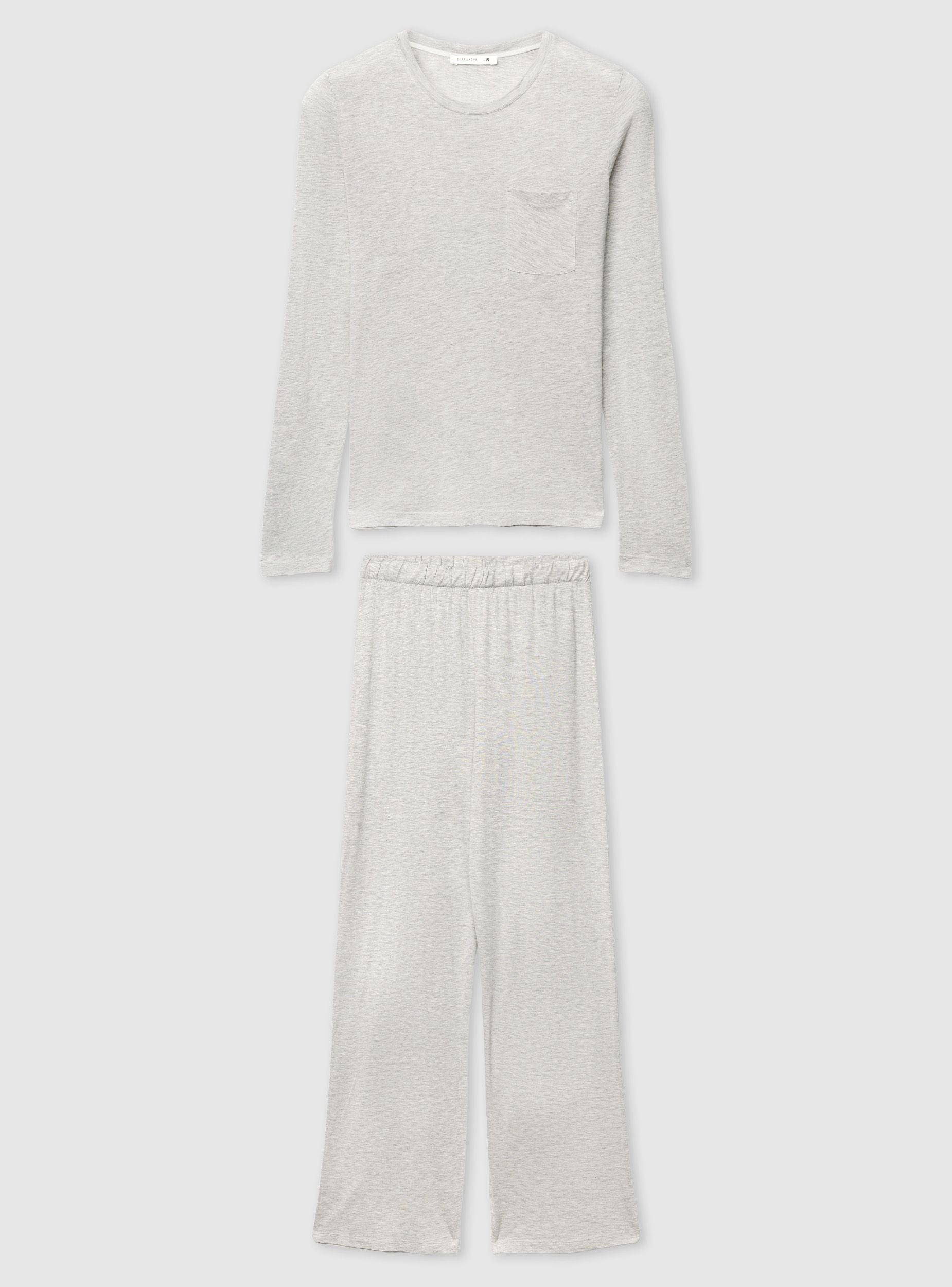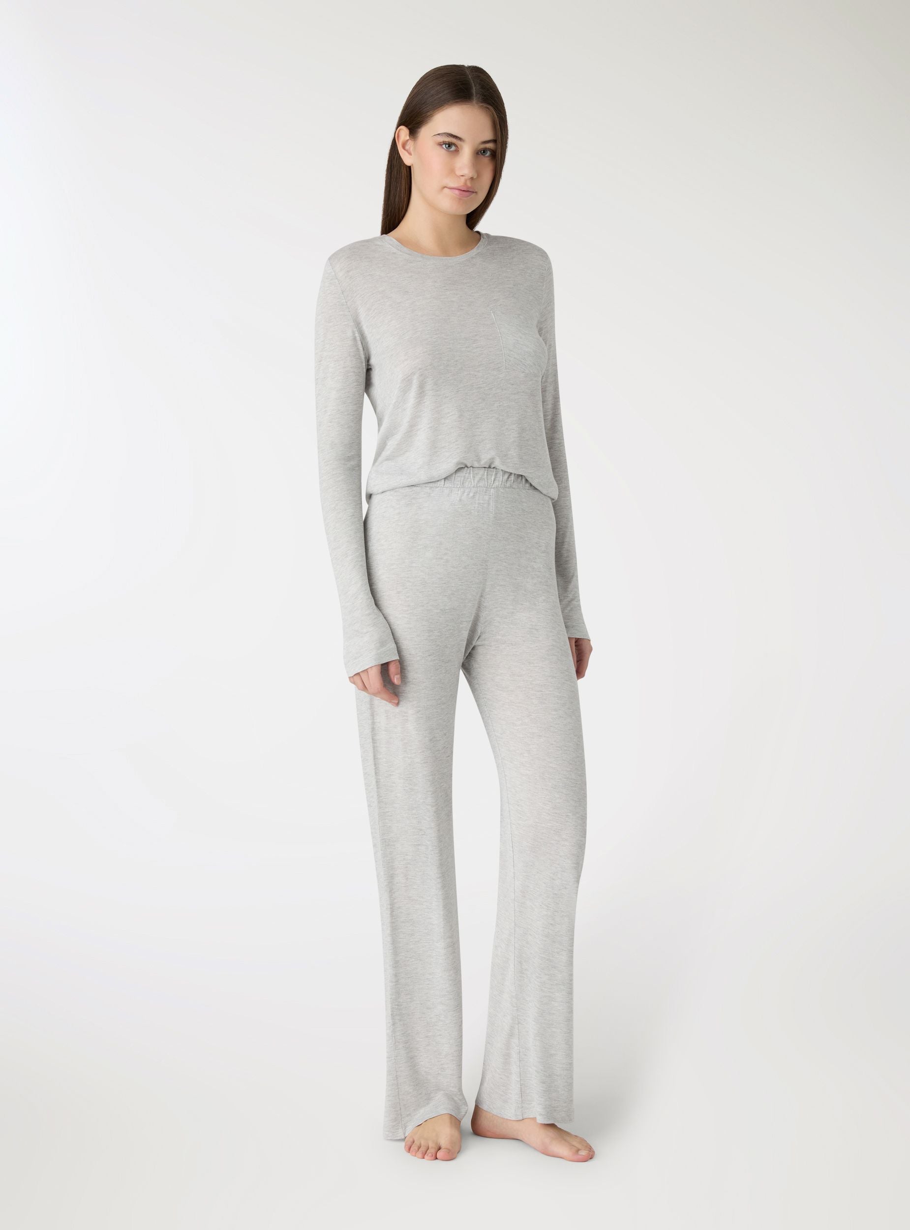 Pyjama femme avec t-shirt à manches longues et pantalon long. T-shirt à col rond avec petite poche appliquée, coupe confortable idéale pour se détendre à la maison. Pantalon à coupe large avec taille élastiquée. Parfait pour les soirées tranquilles et les matins paresseux, il se marie avec des peignoirs et des chaussons. Design uni.Détails