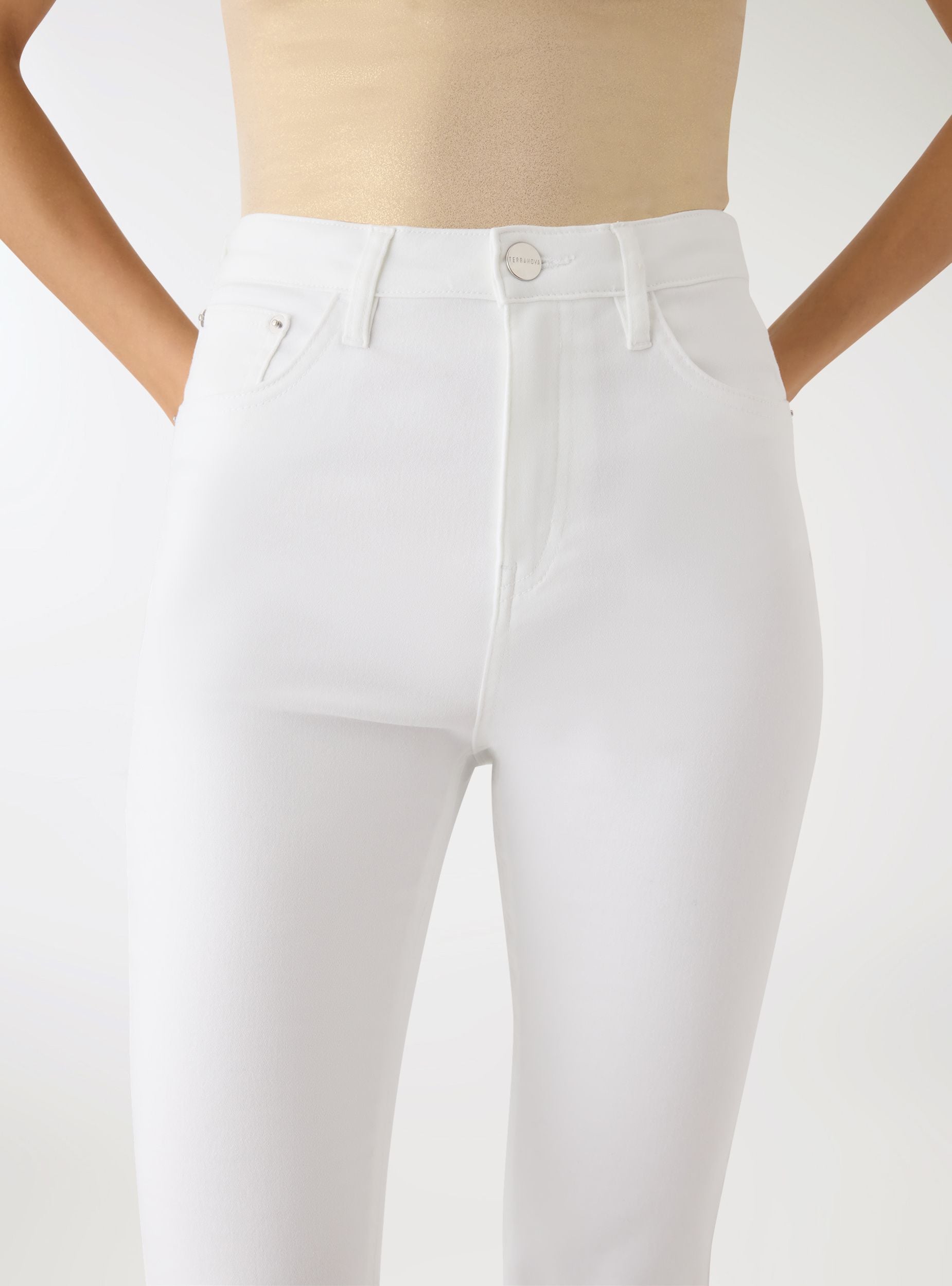 Jeans pour femmes unis avec une coupe évasée et taille haute, parfaits pour allonger la silhouette. Modèle cinq poches avec fermeture par bouton et zip, passants pour ceinture et poches arrière appliquées. Coupe régulière et évasement large en bas, idéal avec des chemises rentrées ou des tops courts et des bottines pour un look urbain au style vintage. Un vêtement polyvalent pour les loisirs et les sorties en soirée.Détails