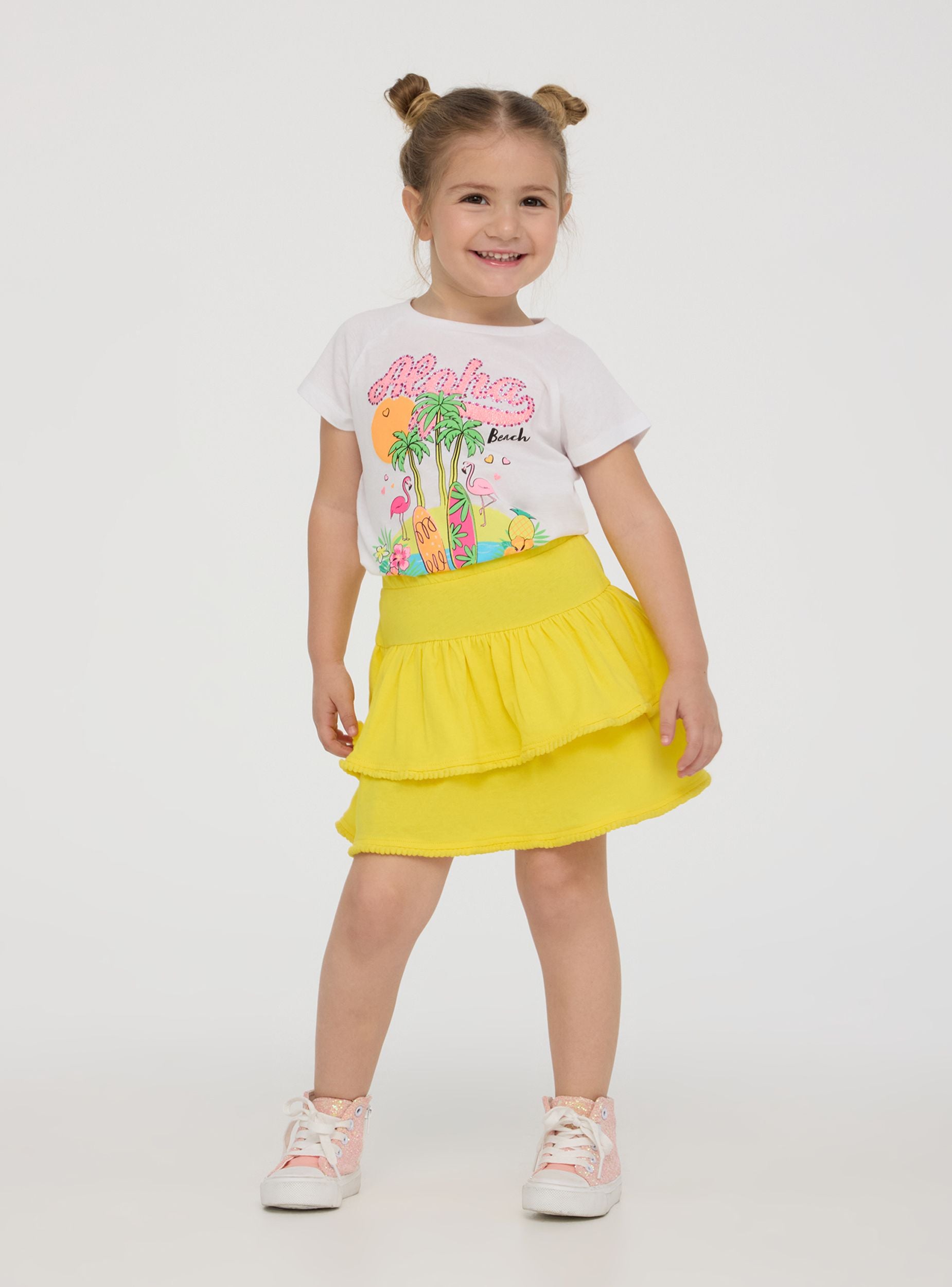 Jupe courte pour fille au design vif et espiègle, parfaite pour des looks frais et amusants. La couleur unie la rend facile à assortir, tandis que les volants ajoutent une touche de mouvement. L'élastique à la taille assure un ajustement confortable, idéal pour jouer et se détendre. De délicates pompons décorent l'ourlet, ajoutant un détail original. Parfaite avec un t-shirt et des sandales pour la journée ou avec un blouse pour une occasion spéciale.