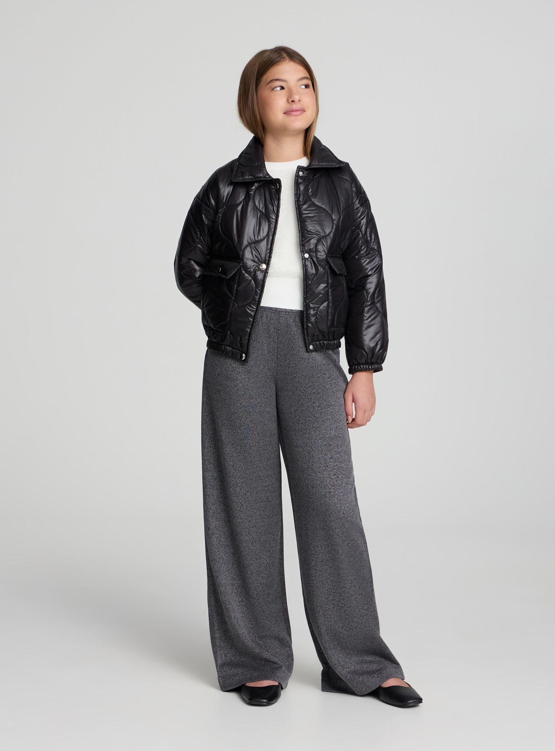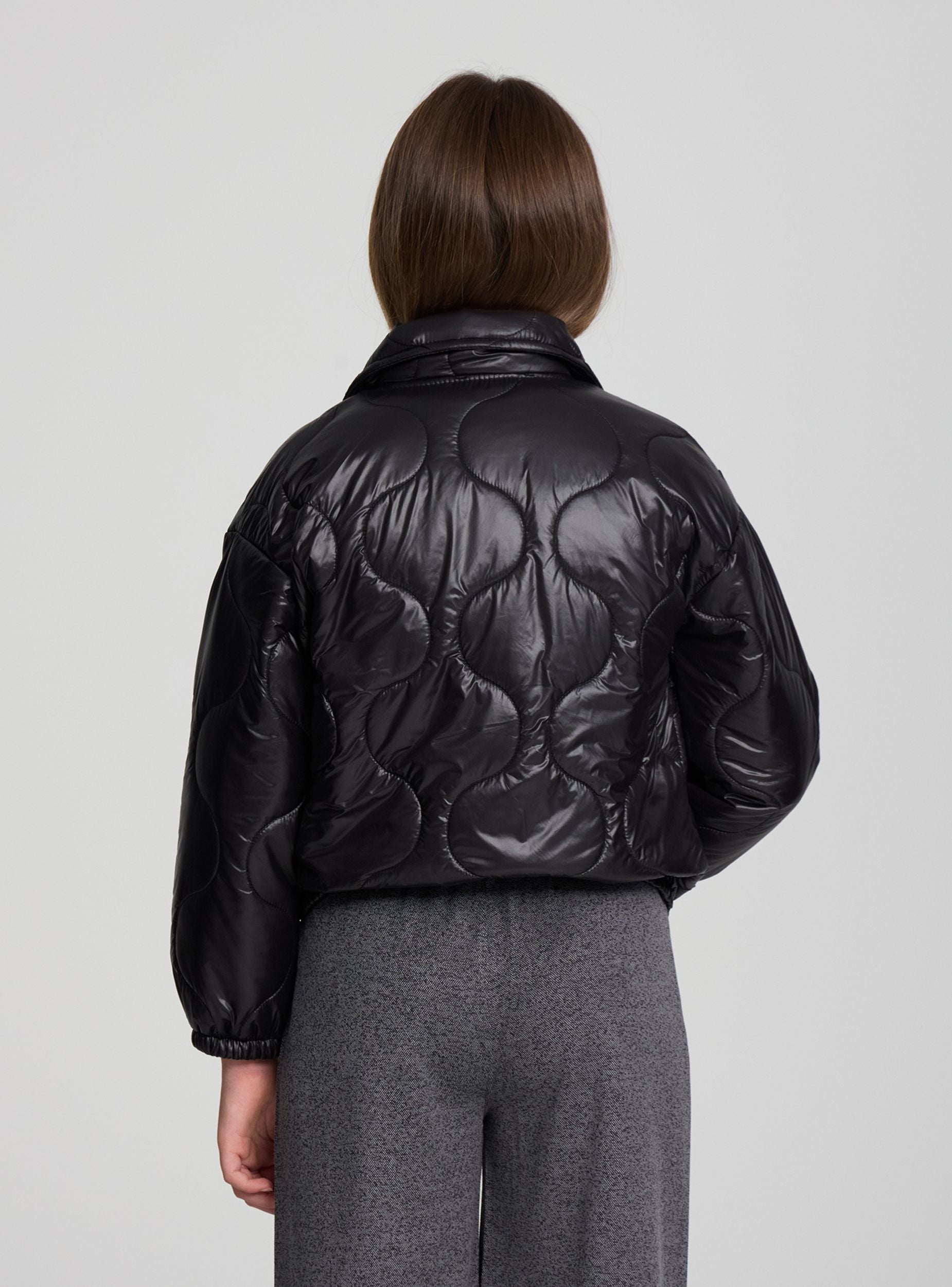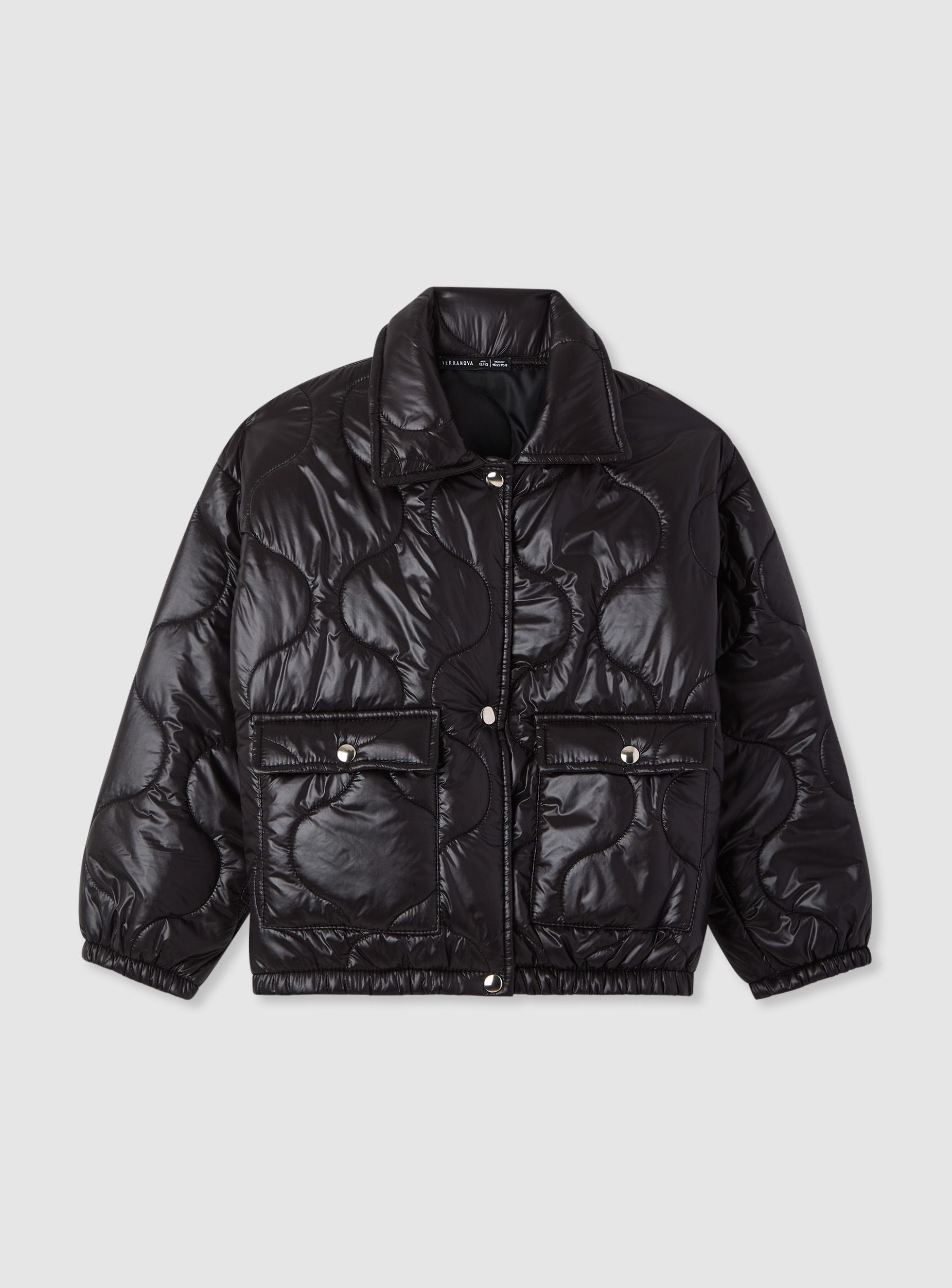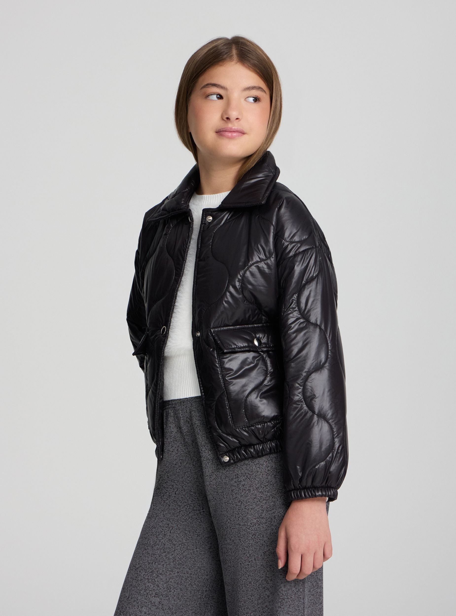 Blouson matelassé pour fille, idéal pour la mi-saison et les journées en ville. Col chemise, manches longues avec bas élastiqué et fermeture frontale par boutons-pression. Poches appliquées avec rabat pour plus de praticité. Coupe régulière et finition unie, facile à assortir avec des jeans, leggings ou jupes pour un look décontracté et tendance.Détails