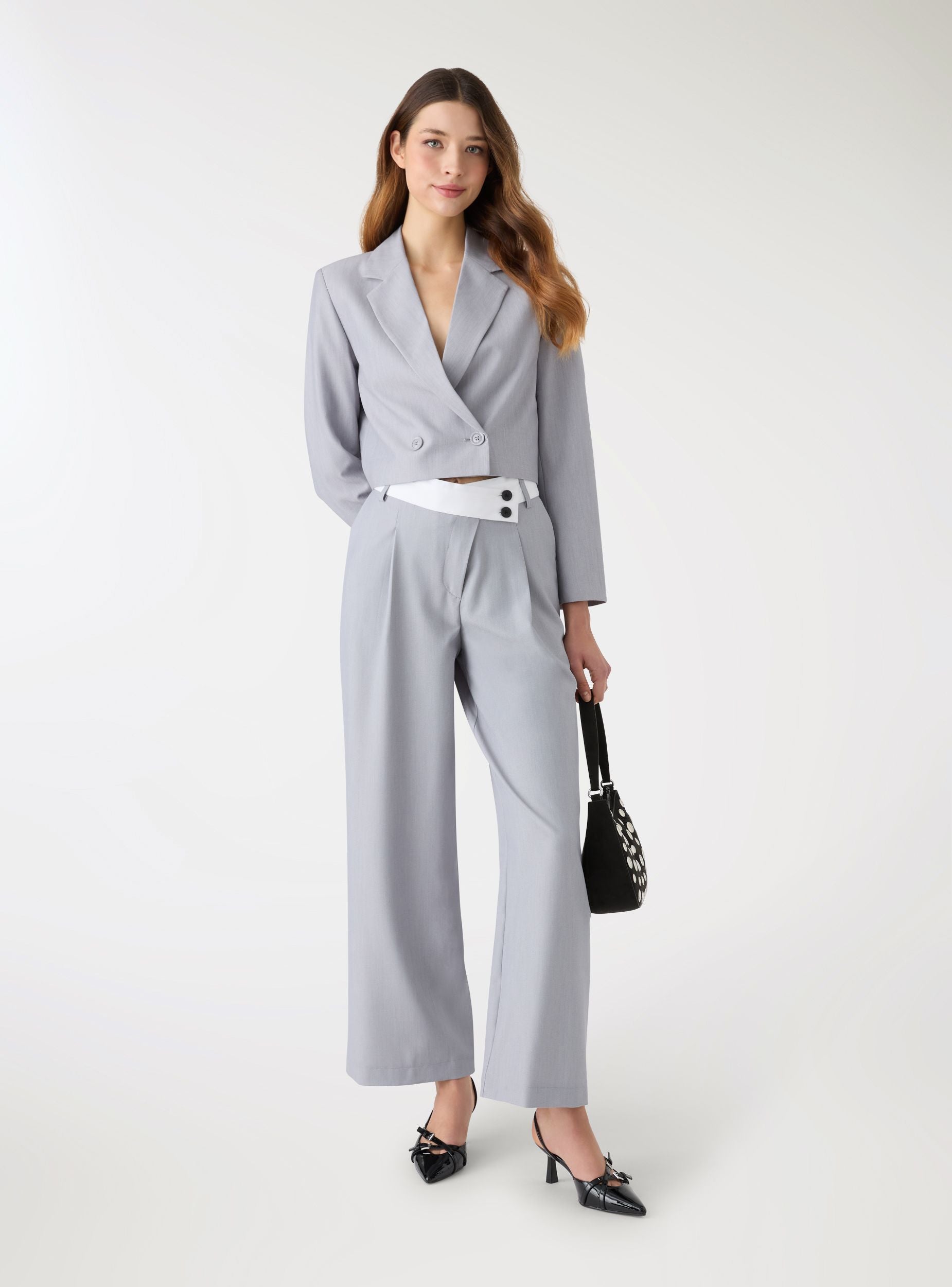 Pantalon pour femme uni avec jambe large et coupe droite, parfaits pour un look décontracté ou urban chic. Taille avec bande contrastante et double bouton latéral, passants pour ceinture et pli frontal qui valorise la coupe. Poches latérales intégrées et longueur à la cheville pour un effet moderne. À assortir avec des chemises ou des tops ajustés et des blazers pour des tenues de bureau ou de loisirs.Détails