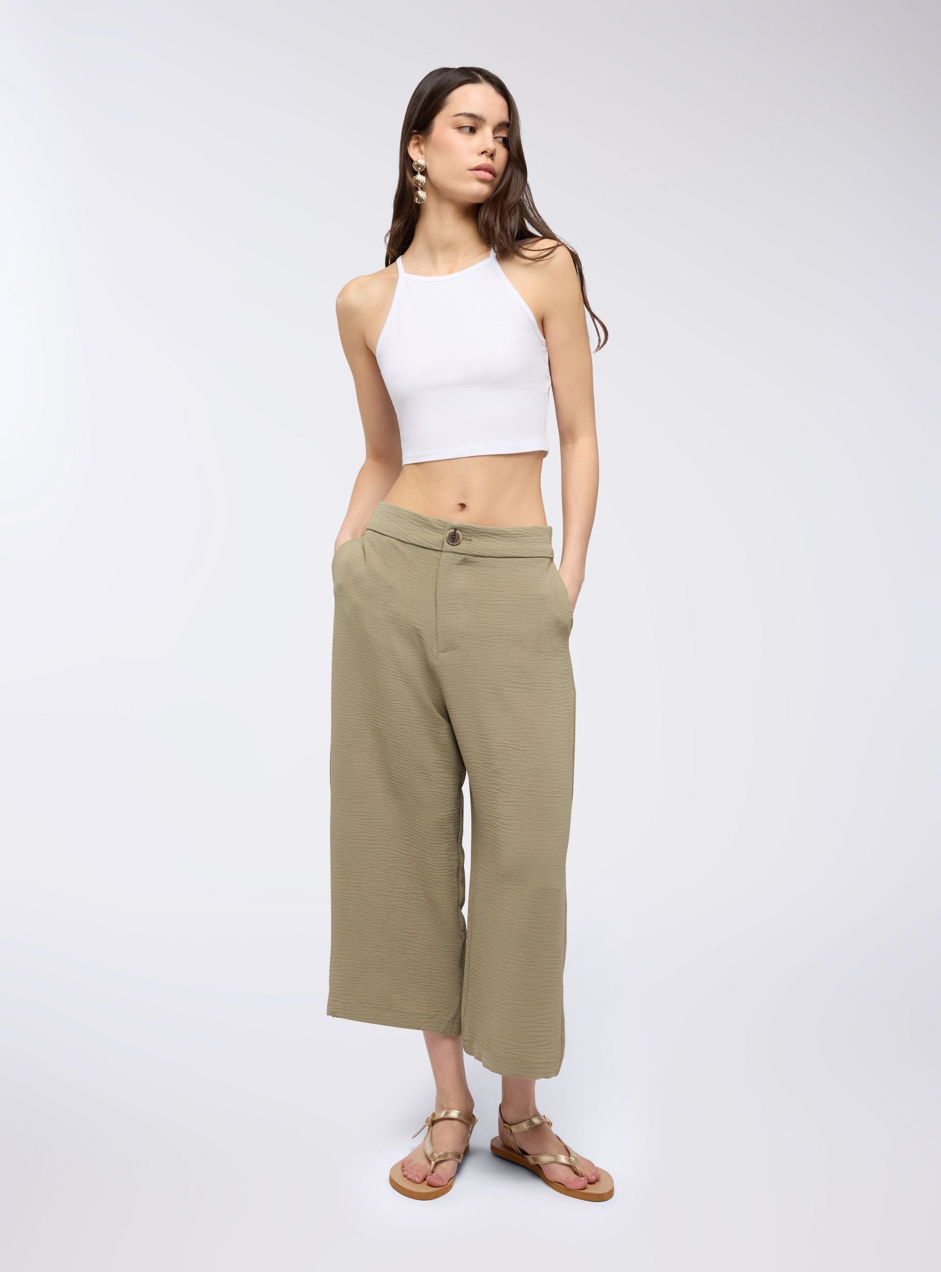 Pantalons femmes au style contemporain, parfaits pour un look casual-chic lors des journées d'été. La coupe large palazzo assure confort et fraîcheur, idéale pour les associations avec des tops ajustés ou des blouses légères. Polyvalents pour les loisirs ou pour une tenue décontractée mais soignée, ces pantalons cropped sont un incontournable de la saison.Détails