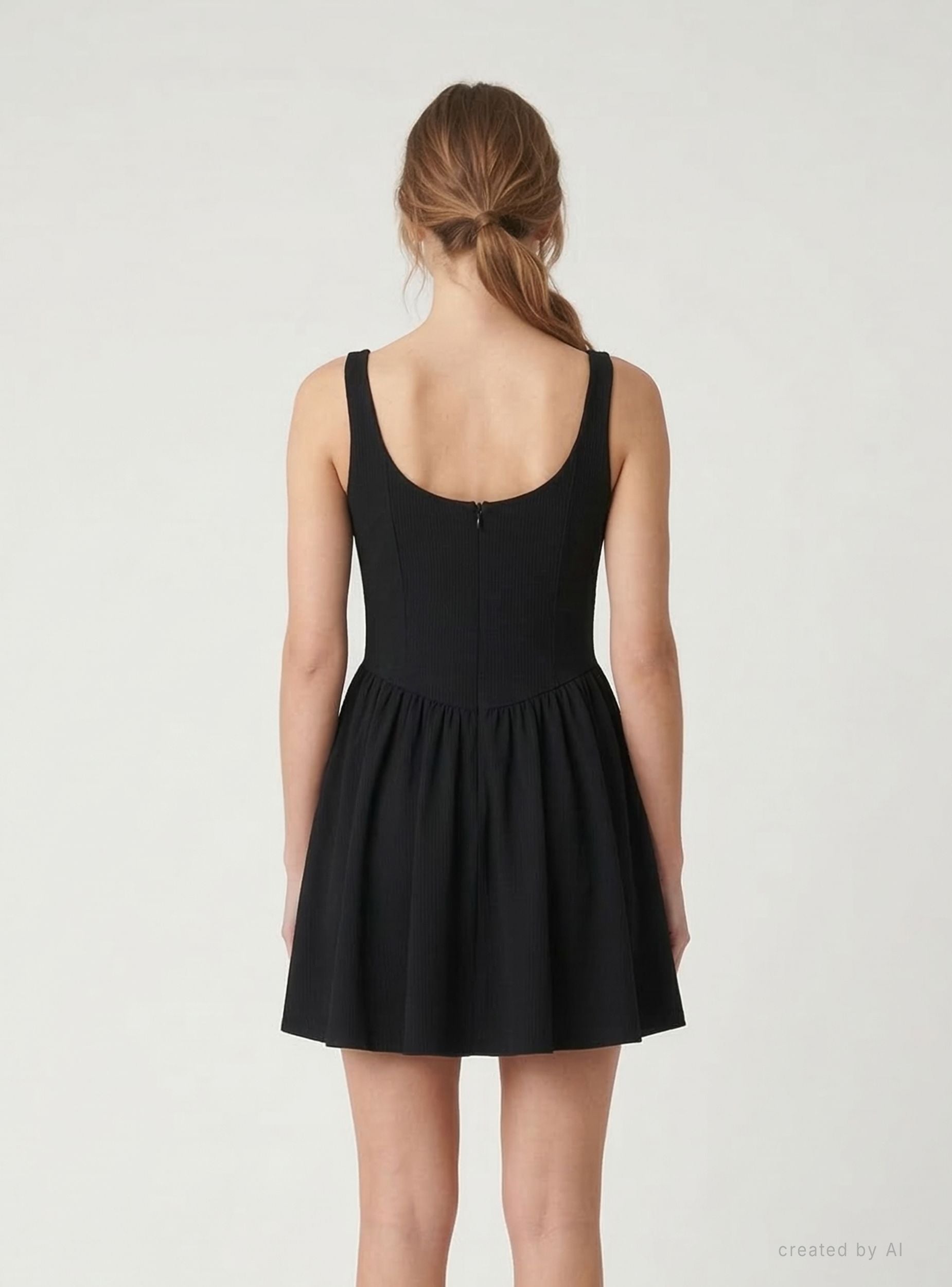 Robe femme unie avec larges bretelles et encolure arrondie. Corsage cintré avec coutures mettant en valeur la silhouette et jupe évasée avec fronces pour un effet dynamique. Longueur mini, idéale pour les sorties en soirée ou les occasions spéciales. Se porte avec des sandales ou des bottines et une veste légère. Fermeture arrière zippée pour un ajustement pratique.Détails