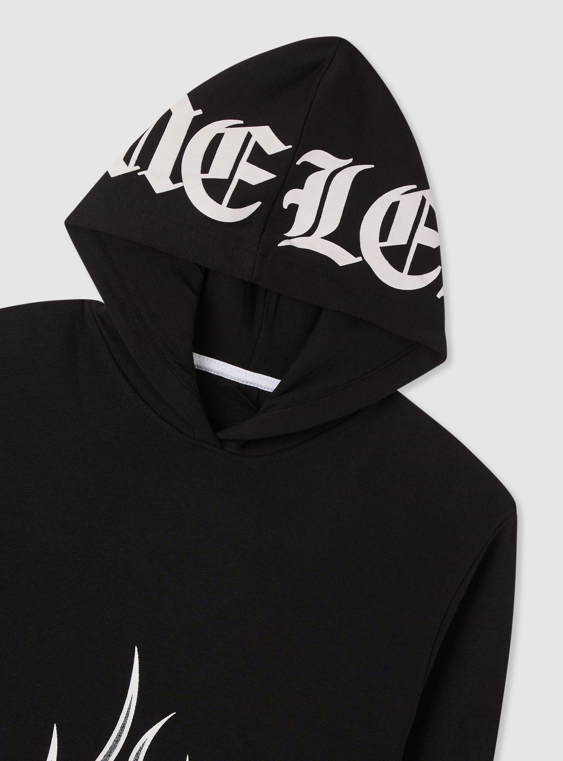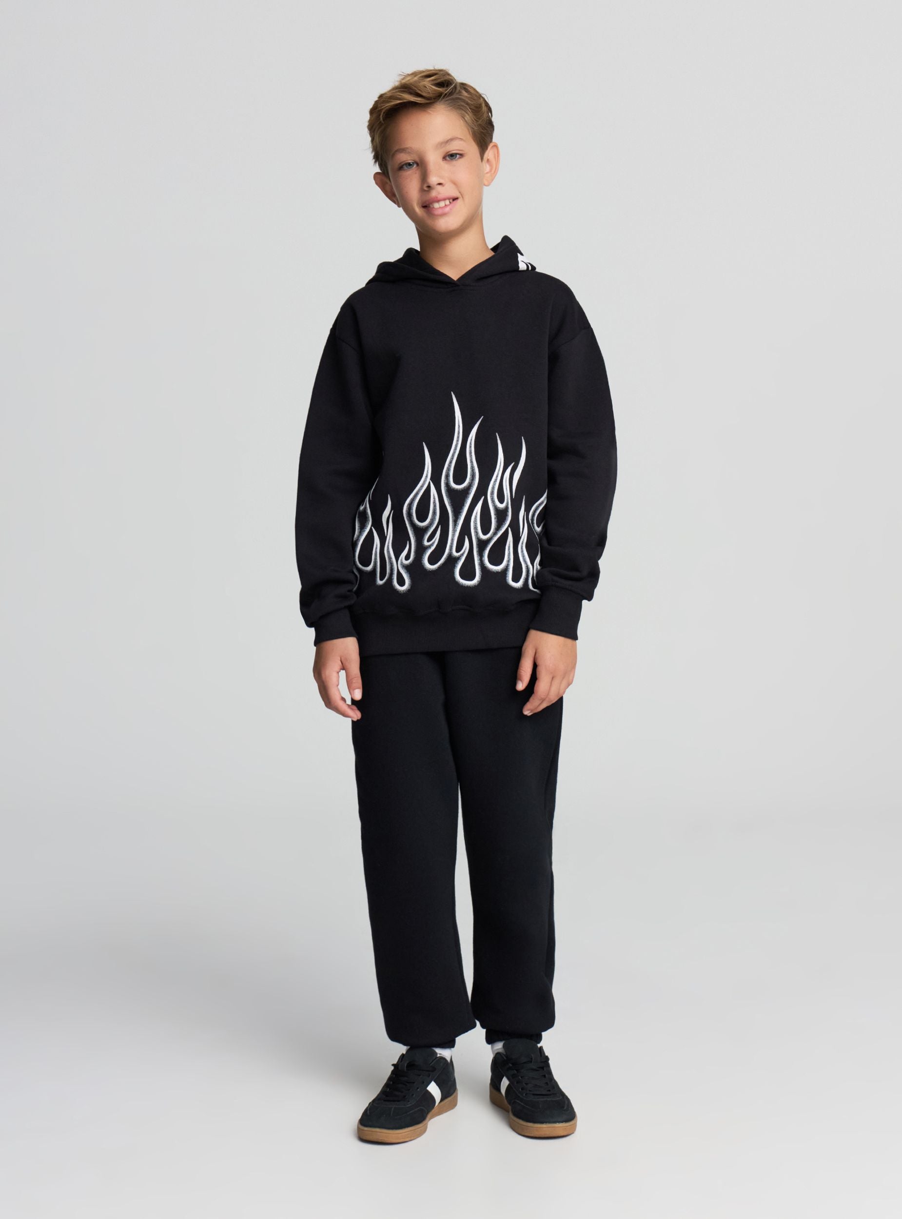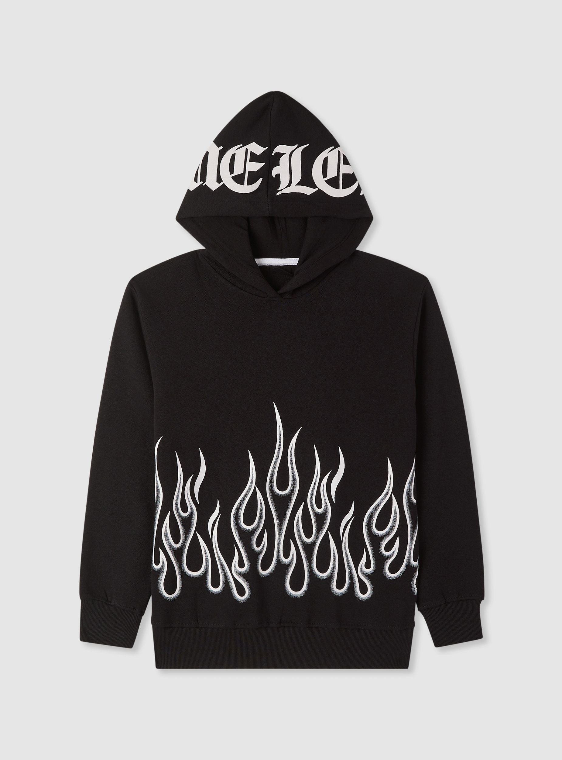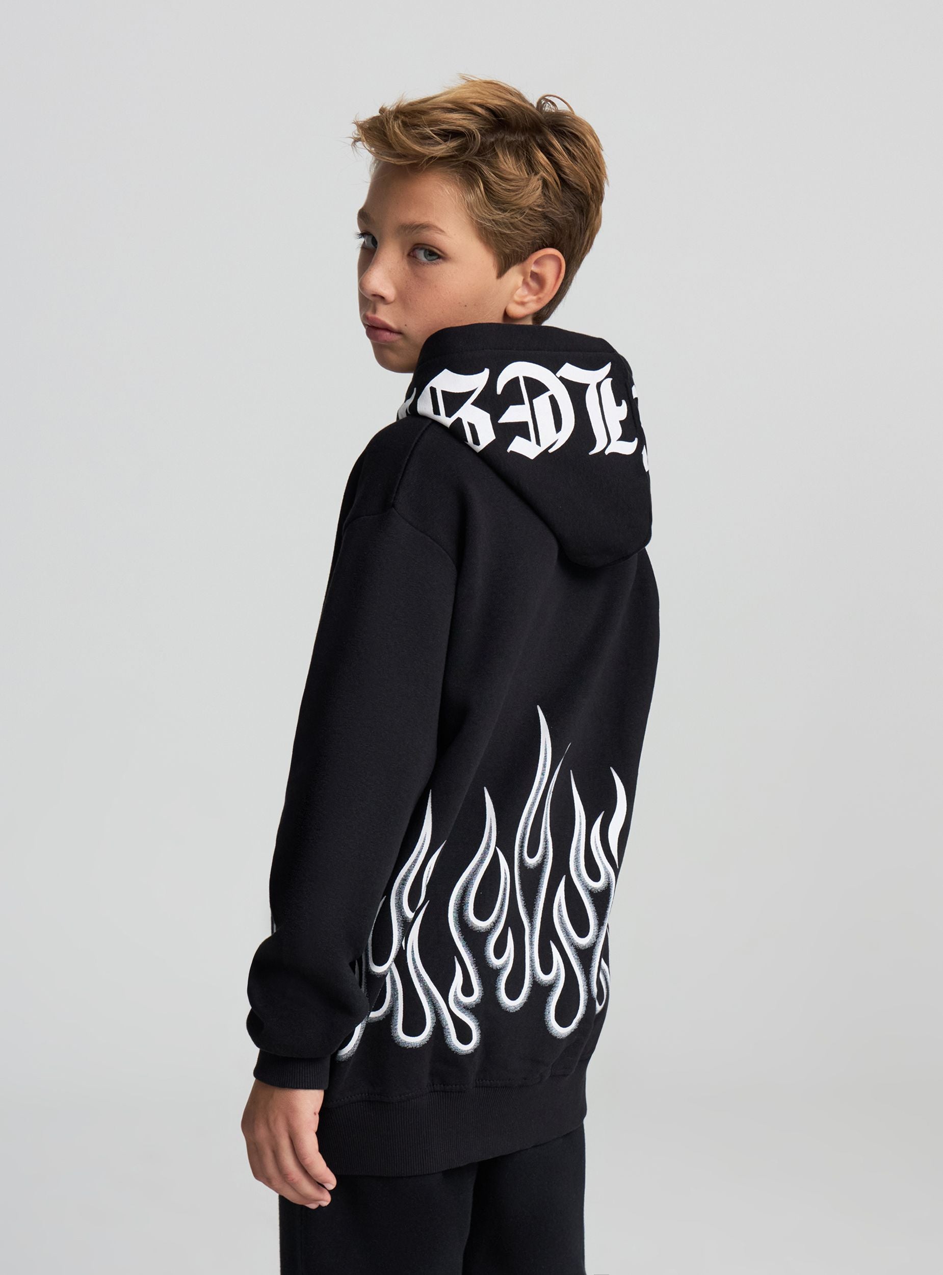 Sweat à capuche pour enfant, sans fermeture éclair, idéal pour les loisirs et l'école. Il présente des manches longues et un bas avec poignets et bord côtelé pour un ajustement confortable. Le motif flammes à l'avant ajoute une touche dynamique, tandis que l'inscription sur la capuche complète le look. Parfait avec un jean ou un pantalon jogger pour des tenues décontractées et tendance.Détails