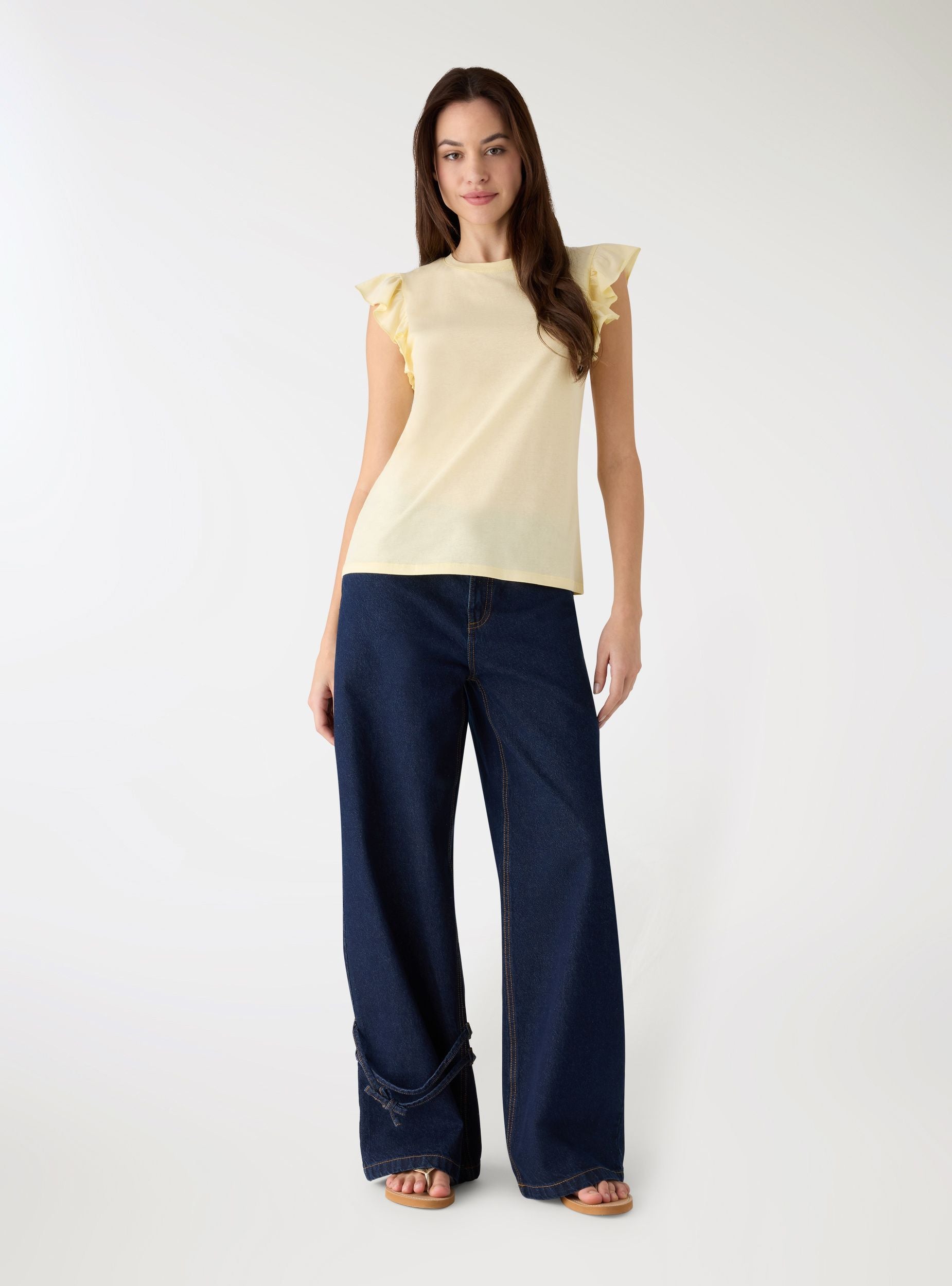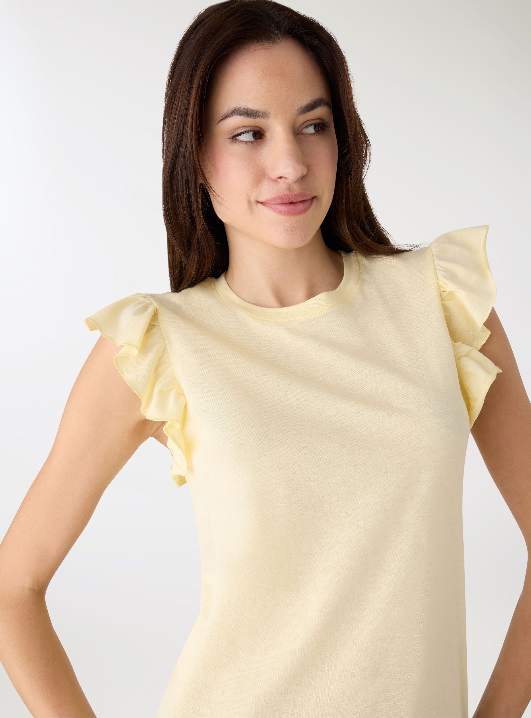 T-shirt femme unie avec col rond et manches courtes froncées à volants, apportant une touche féminine. Coupe régulière, longueur standard et ourlet droit pour un look facile à assortir. Parfaite avec un jean, une jupe ou un short pour les loisirs ou un bureau décontracté. Un basique à porter sous des vestes légères ou des cardigans, idéal pour des tenues quotidiennes soignées.Détails