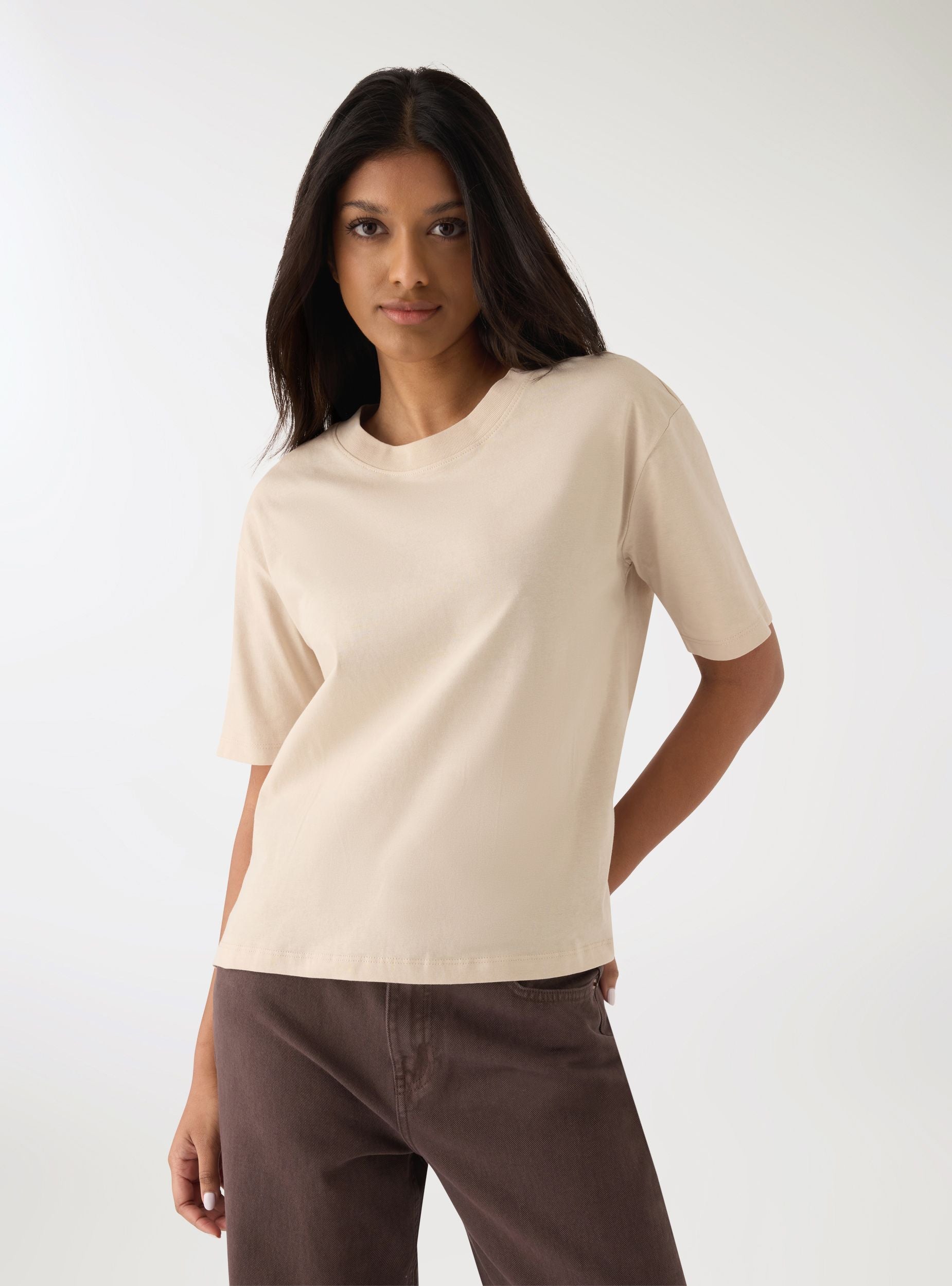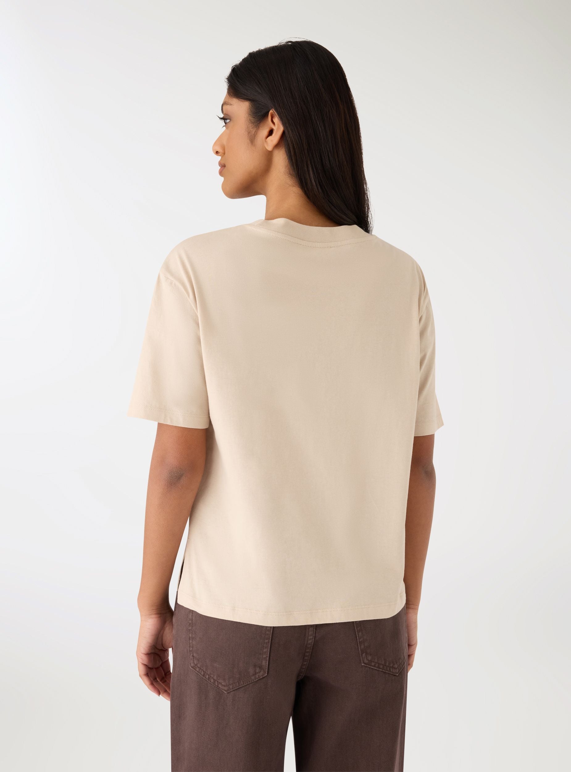 T-shirt femme unie avec col rond et manches courtes, idéale pour tous les jours. Coupe oversize et fentes latérales pour un meilleur confort. Facile à assortir avec des jeans, jupes ou shorts, elle se porte sous des vestes légères ou des sweats pour un look décontracté et polyvalent.Détails
