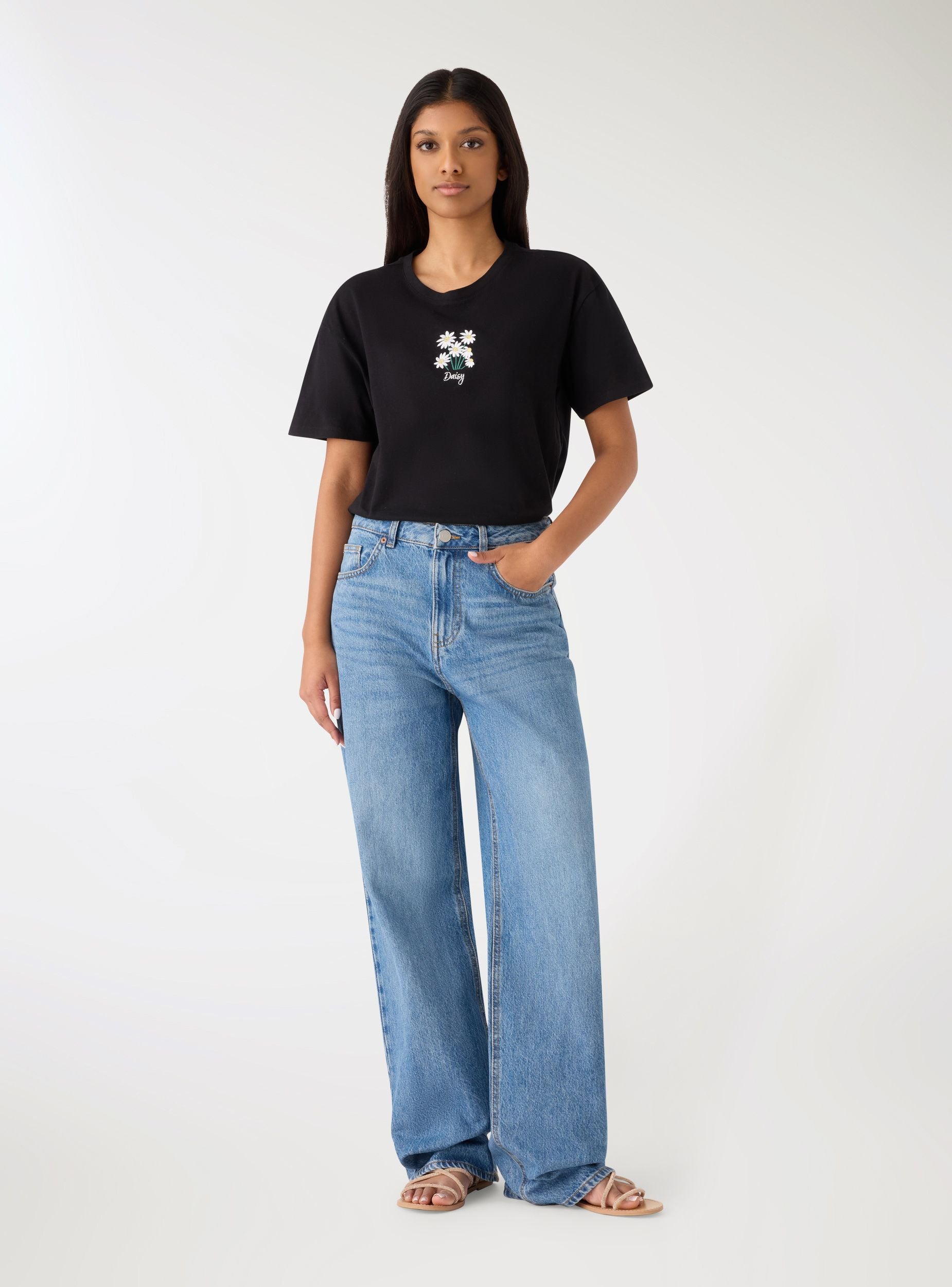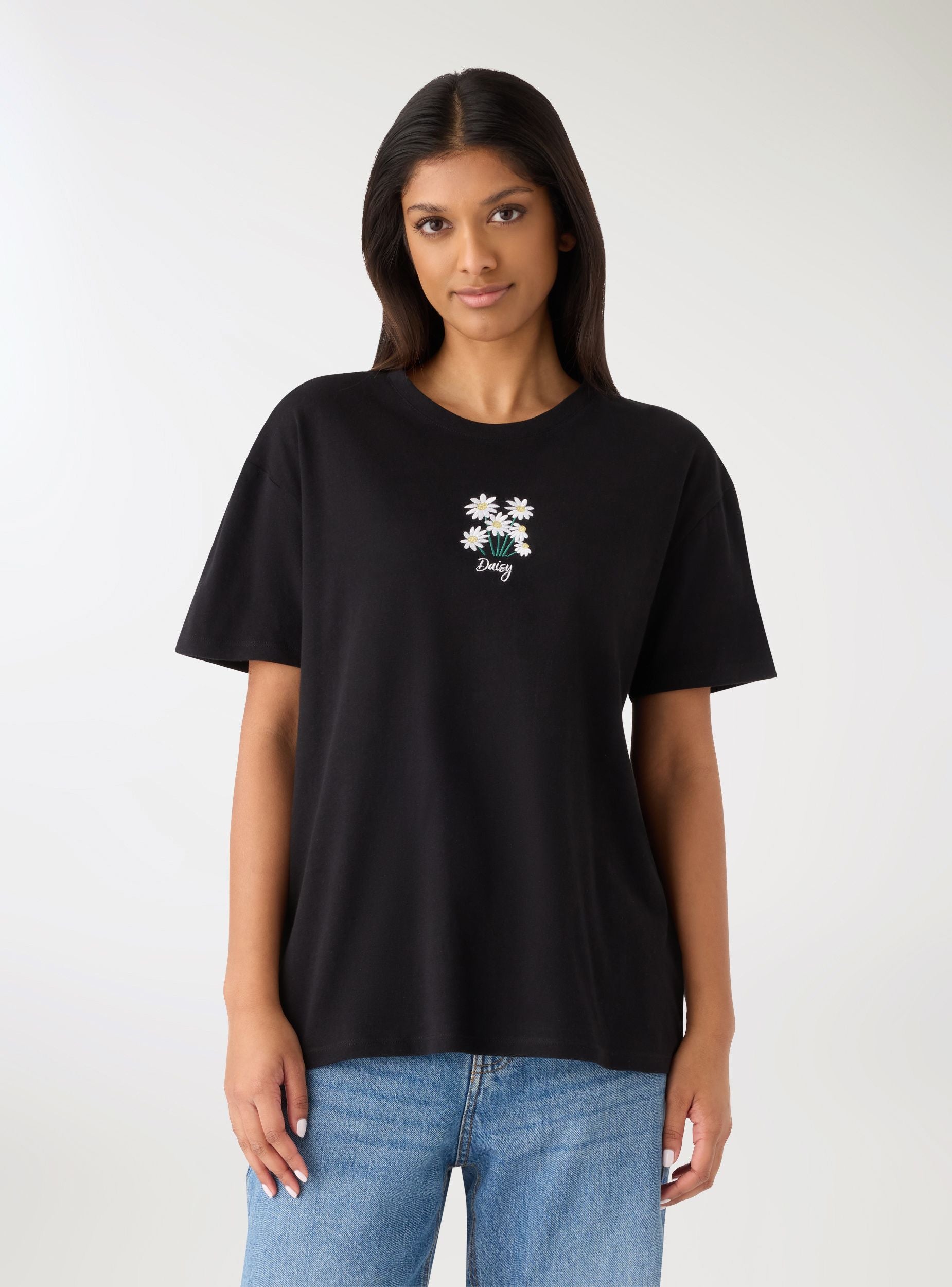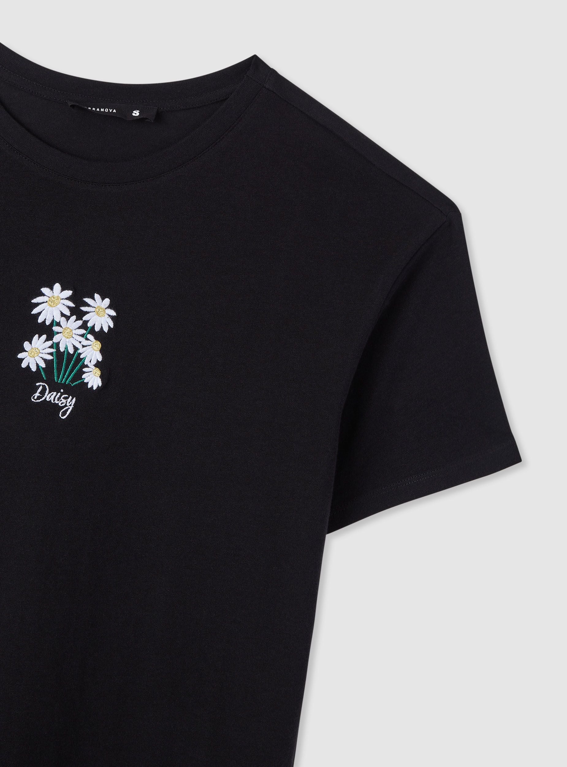 T-shirt femme unie avec broderie florale sur la poitrine. Modèle avec col rond et manches courtes, idéal pour un look décontracté au quotidien. La broderie apporte une touche féminine et se marie facilement avec un jean, un short ou une jupe. Coupe régulière avec ourlets soignés, parfaite sous une veste légère ou un sweat-shirt en mi-saison.Détails