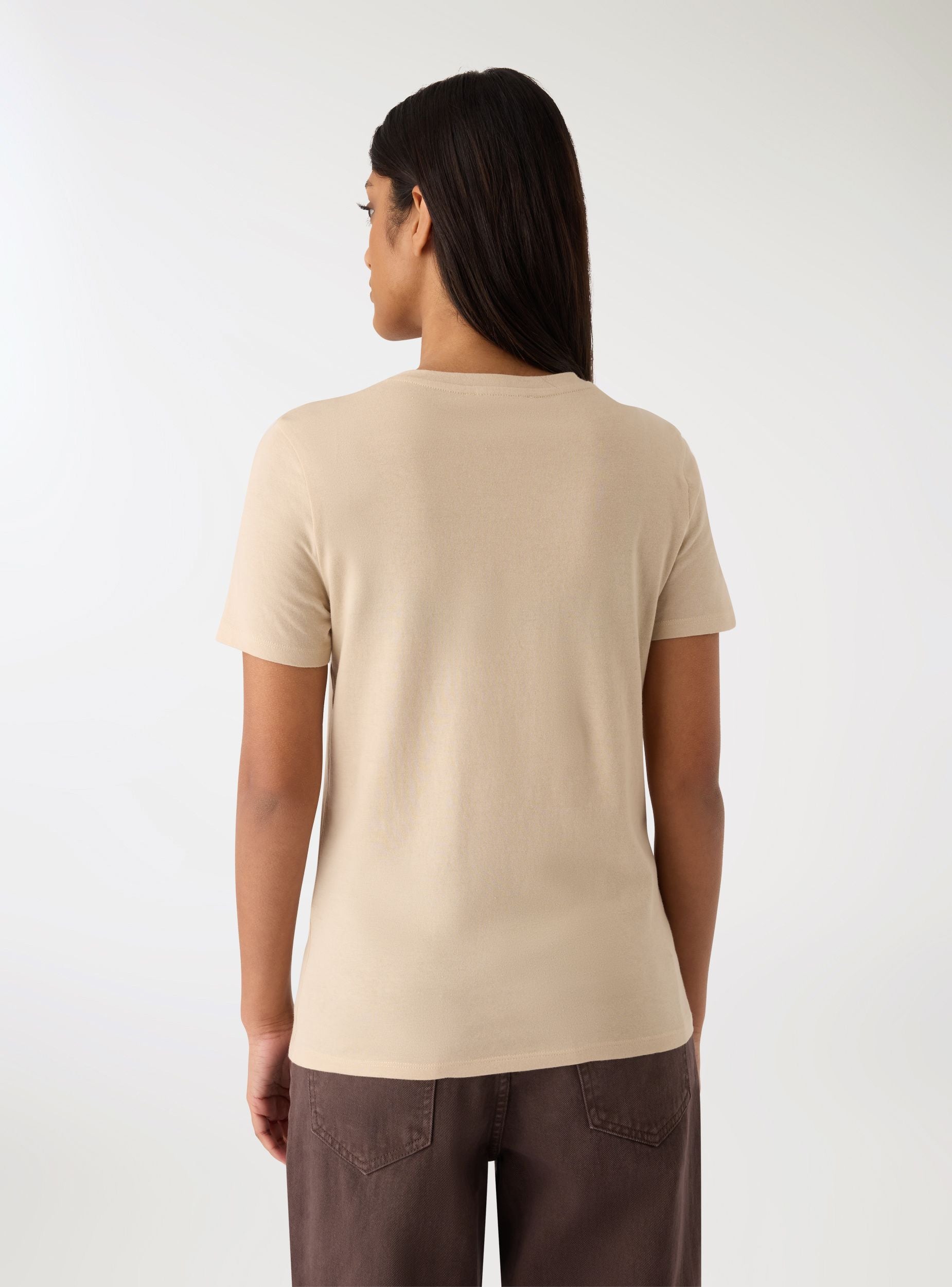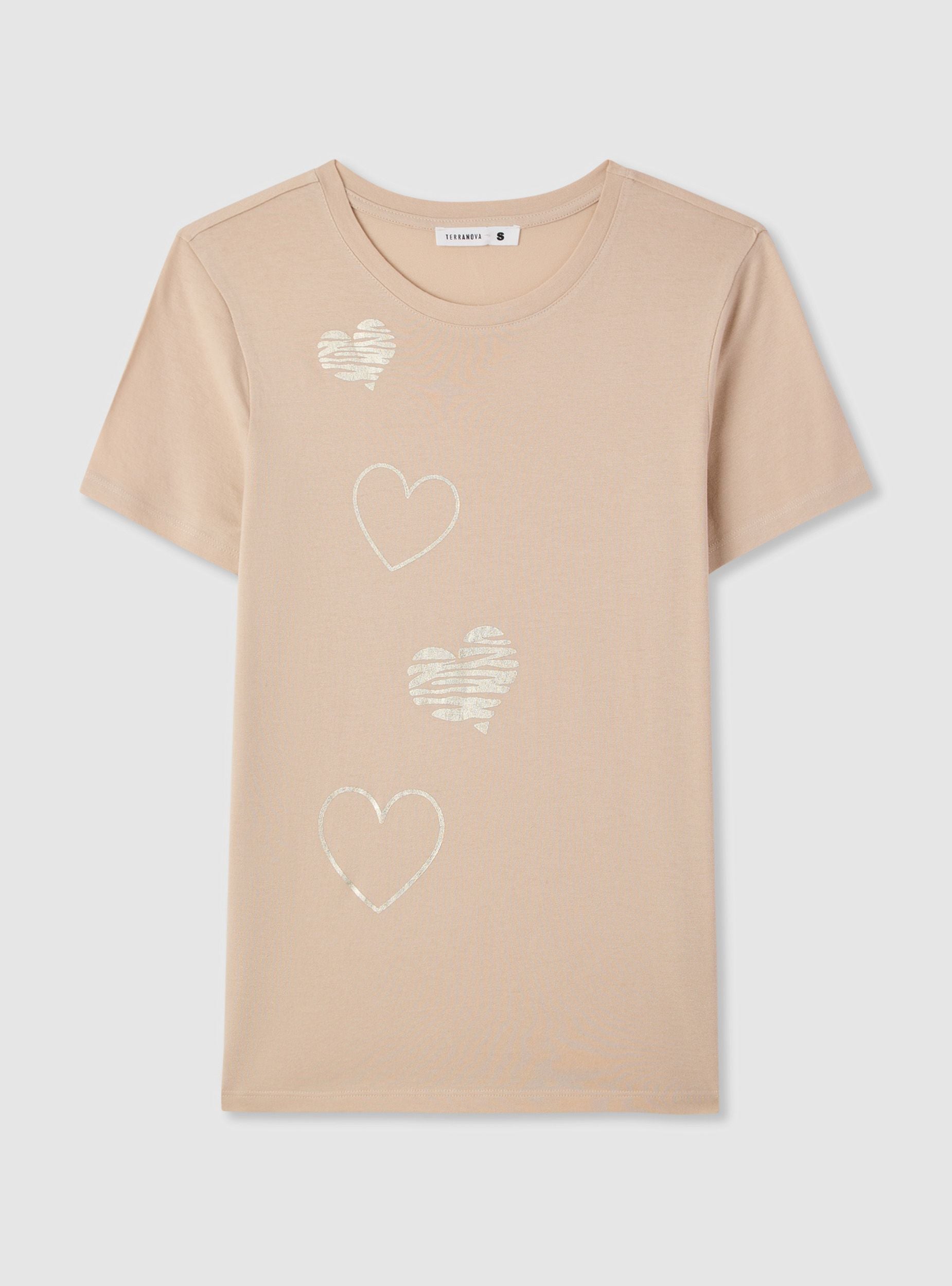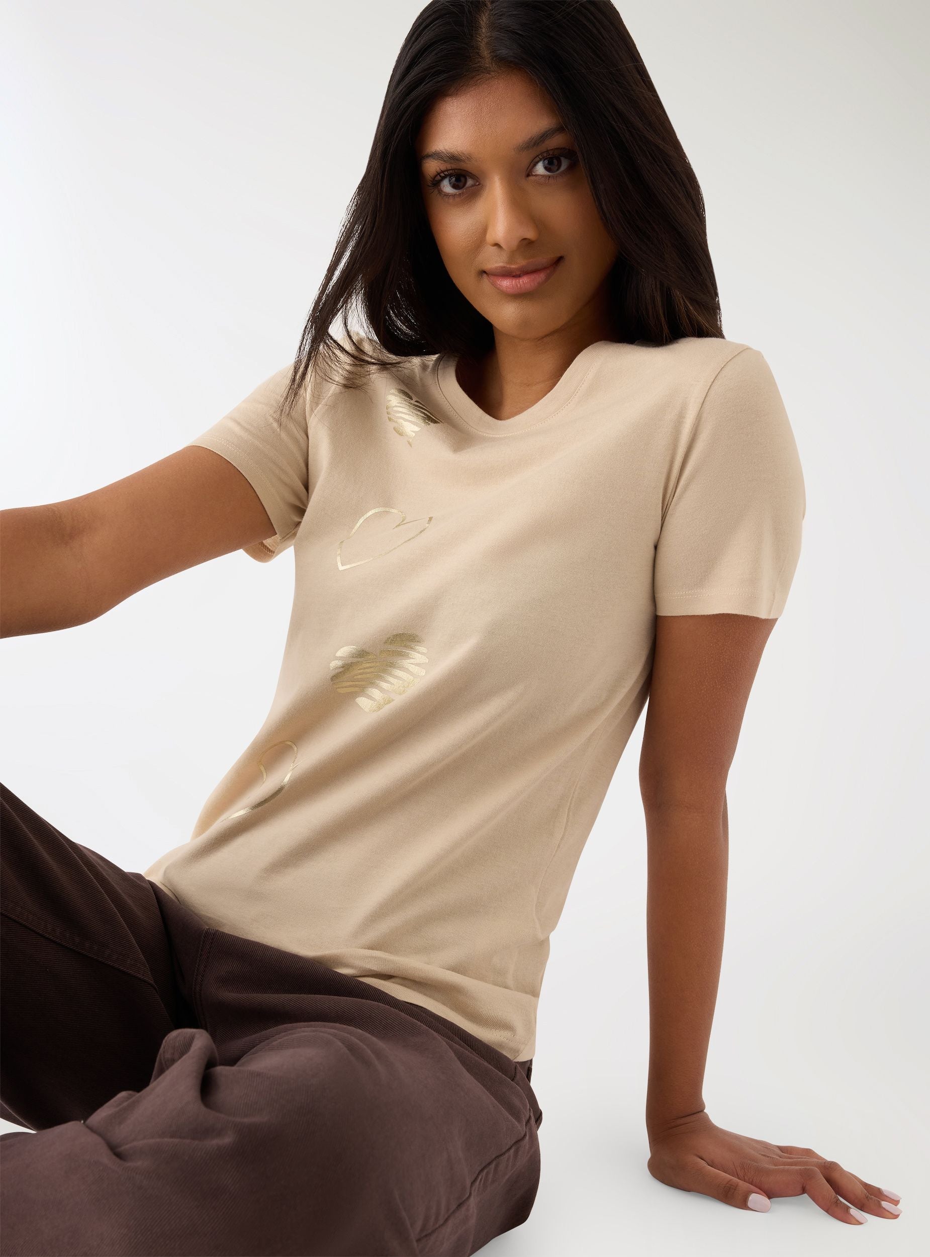 T-shirt femme à manches courtes uni avec imprimé cœurs. Col rond et coupe régulière pour un look facile à associer avec un jean, un short ou une jupe. Détails graphiques à effet scintillant apportent une touche féminine. Parfaite pour les loisirs et les tenues décontractées, elle se porte sous une veste légère ou un cardigan et complète les looks quotidiens avec style.