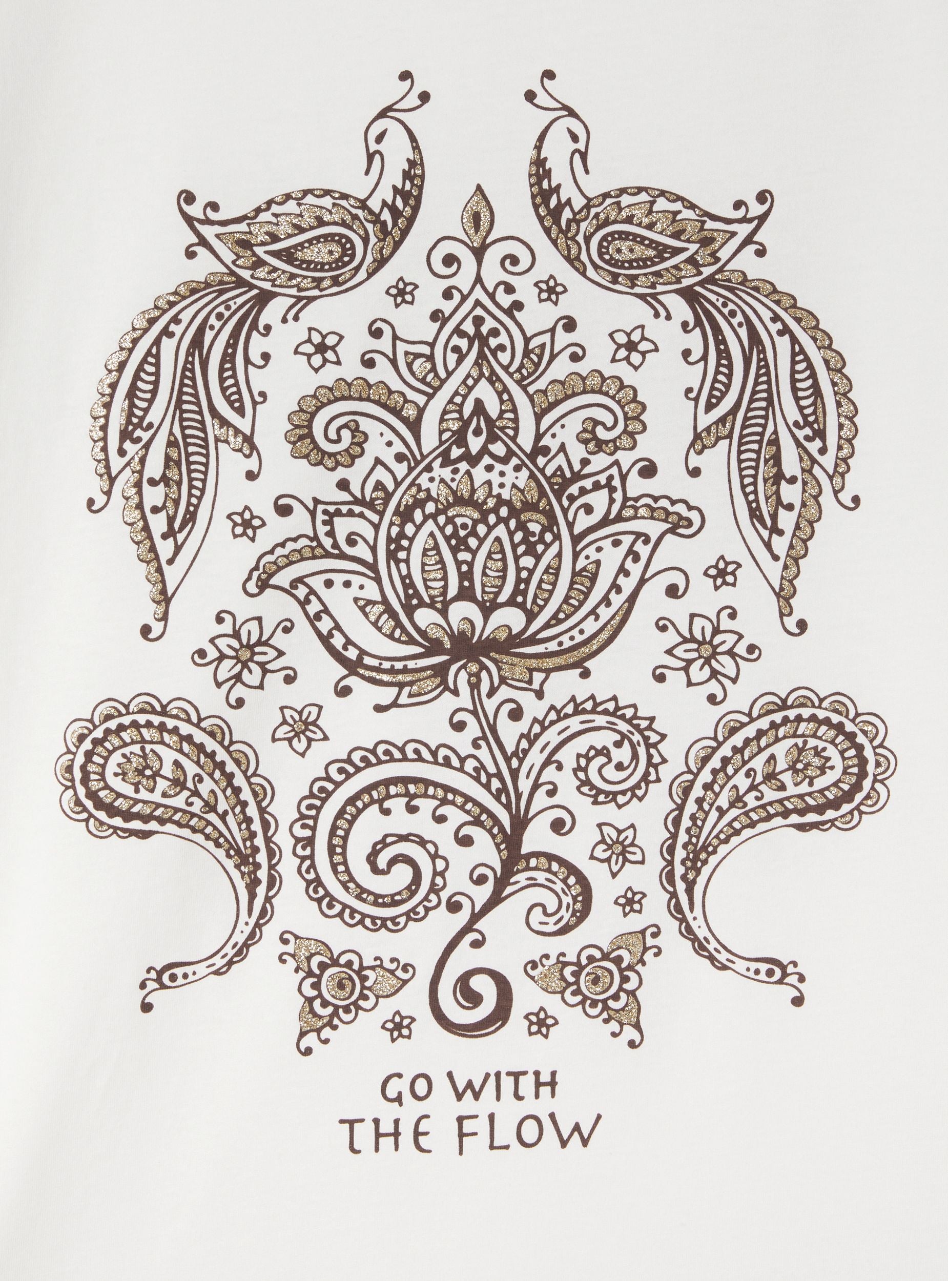T-shirt femme au style boho-chic, parfaite pour un look décontracté mais recherché. Le design avec col rond et manches ornées de franges ajoute une touche de mouvement et d'originalité. L'impression ethnique rehaussée de paillettes donne un effet lumineux et raffiné, idéal pour sublimer des tenues casual ou des ambiances de festival. Les petites fentes latérales garantissent un ajustement confortable et fluide, parfait sur des jeans taille haute ou des jupes longues pour une touche bohémienne.Détails