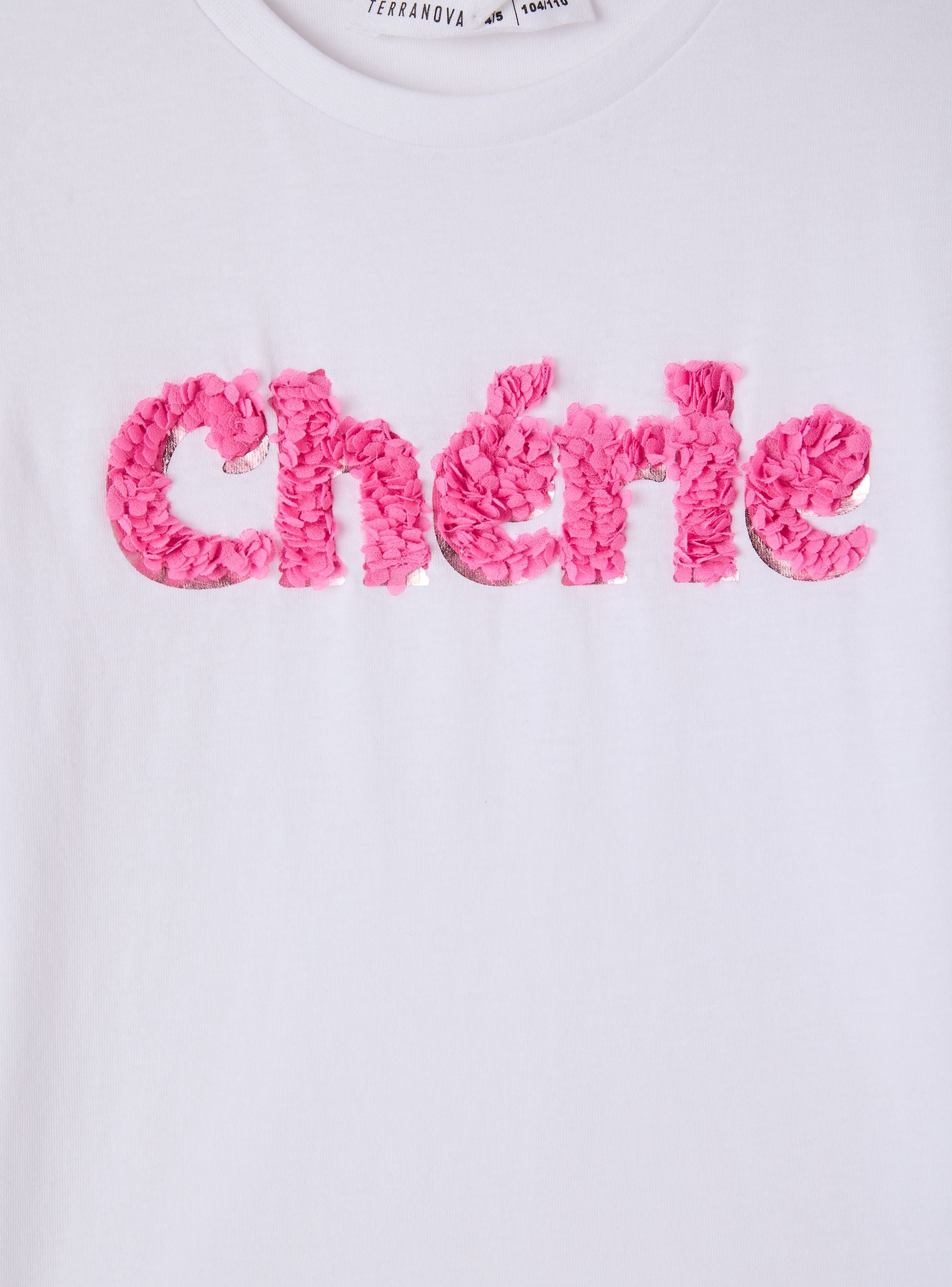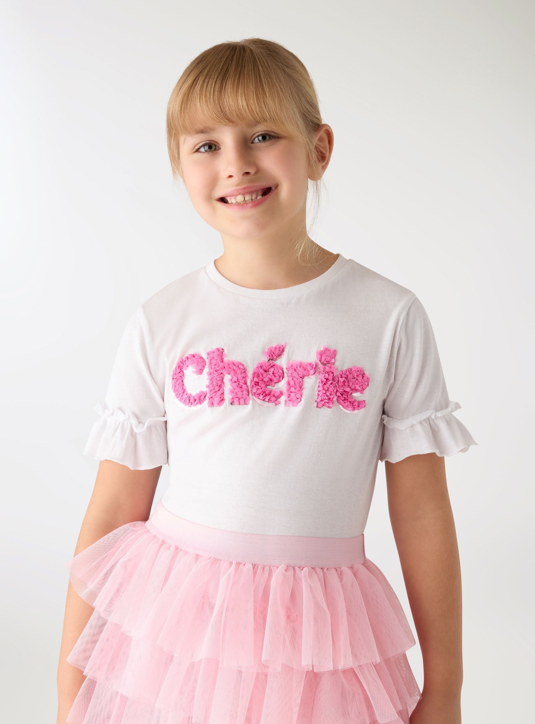 T-shirt pour fille avec manches courtes à volants et col rond. Le motif sur le devant présente une inscription appliquée avec des détails de pétales en relief, idéale pour ajouter une touche ludique aux tenues quotidiennes. Parfaite avec un jean, un short ou une jupe, elle offre une coupe confortable et facile à porter pour l'école et les loisirs.Détails