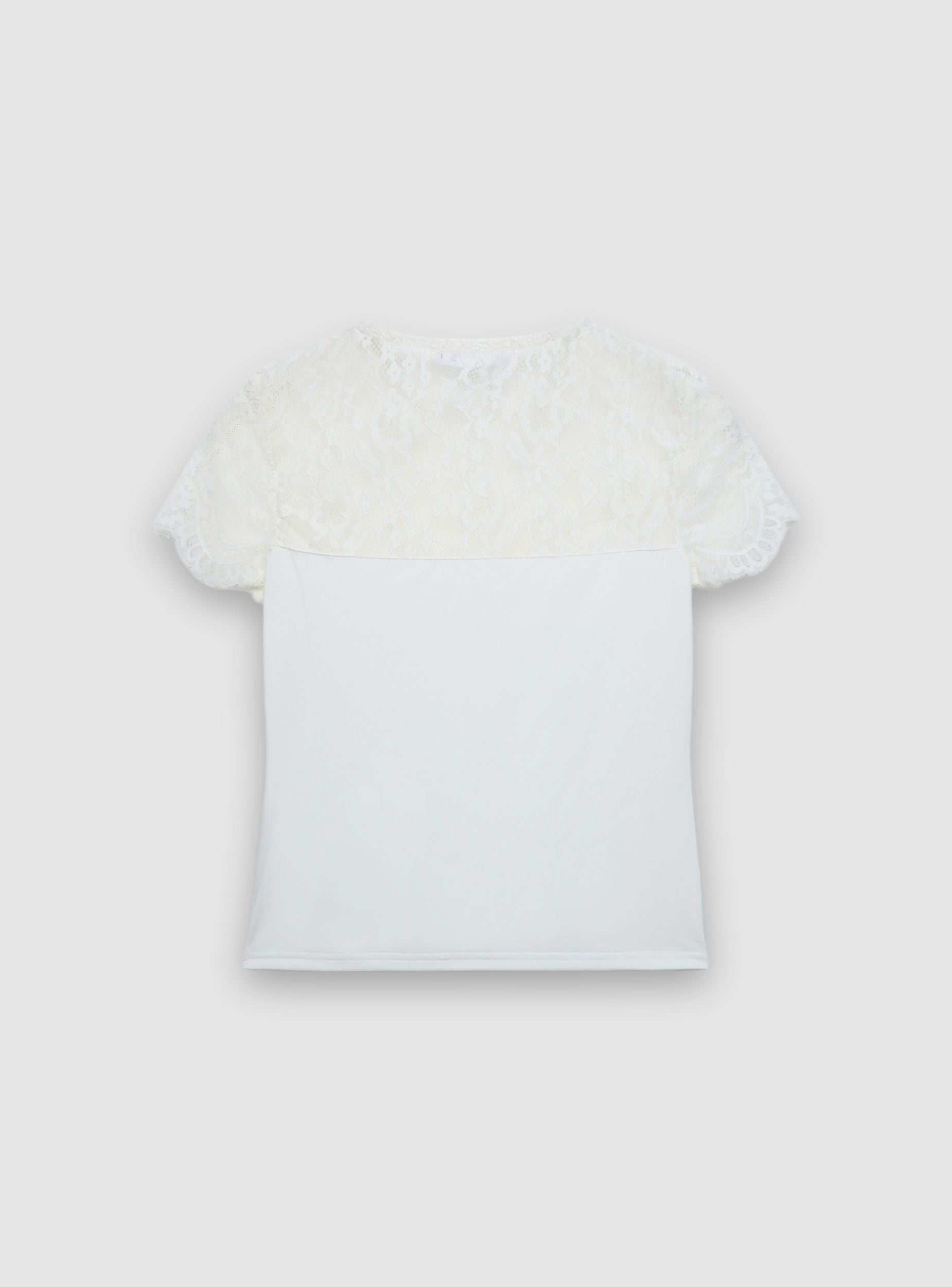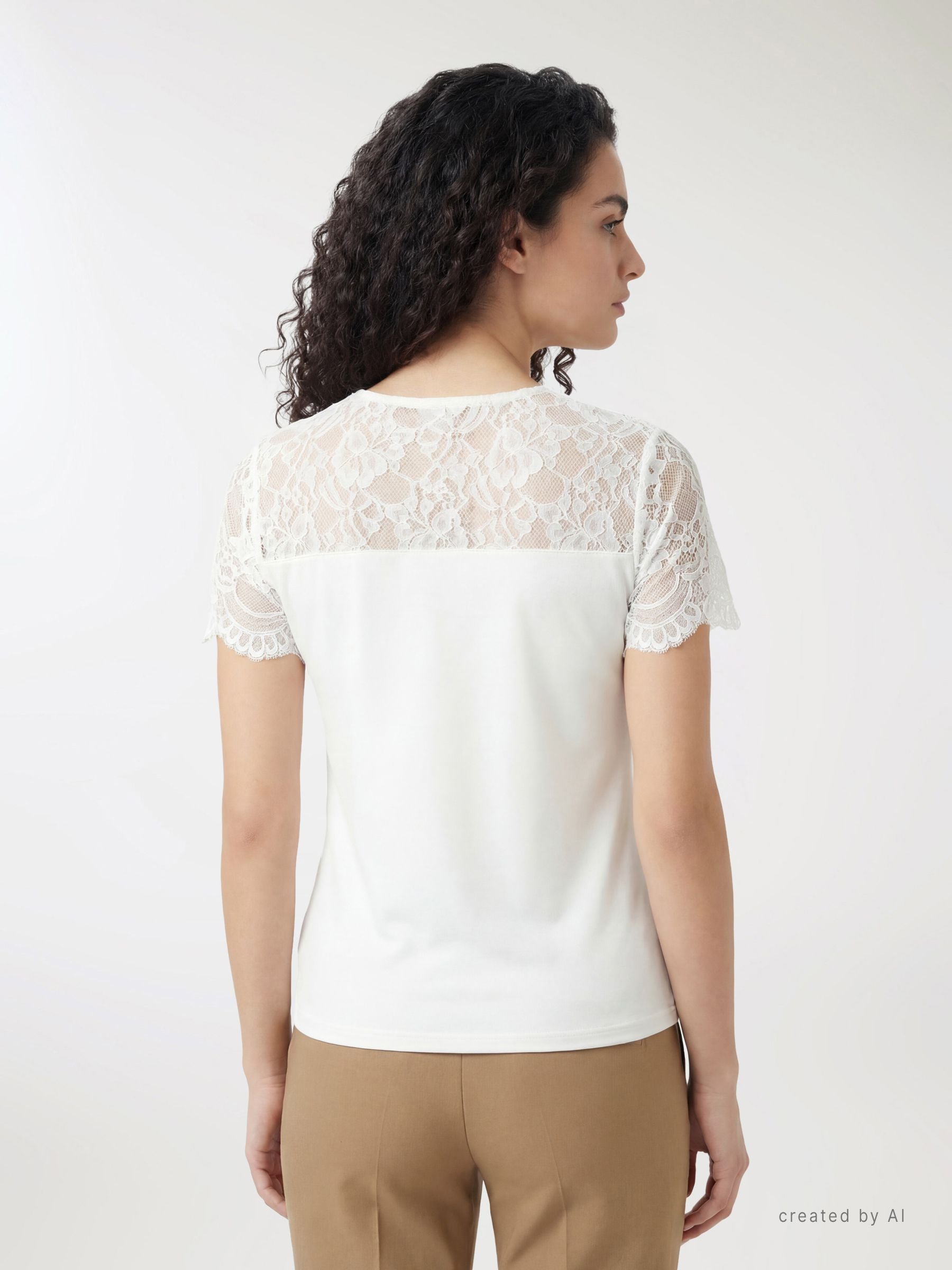 T-shirt femme unie avec insert en dentelle au niveau du col et des manches courtes. Le corps lisse met en valeur le travail floral de la dentelle, créant un effet romantique, idéal pour des tenues de jour ou du soir avec un jean ou une jupe. Col rond, coupe régulière et finitions soignées pour un look féminin et polyvalent qui s’associe facilement avec un blazer ou un cardigan.Détails