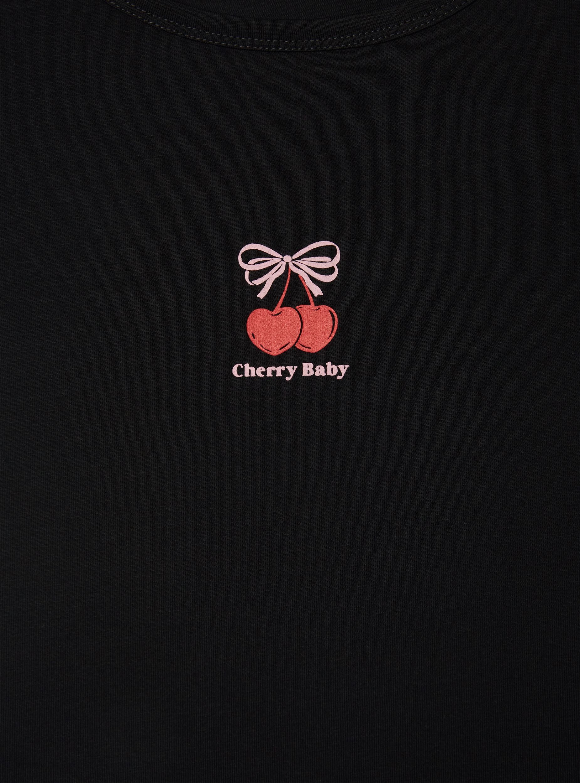 T-shirt femme cropped avec impression de cerises et inscription "Cherry Baby" sur le devant, idéale pour un look décontracté et tendance. Le modèle présente un col rond et des manches courtes, parfait à associer avec un jean ou des jupes taille haute pour une tenue fraîche et jeune. La coupe cropped met en valeur la silhouette, tandis que l'imprimé ajoute une touche ludique et originale.Détails
