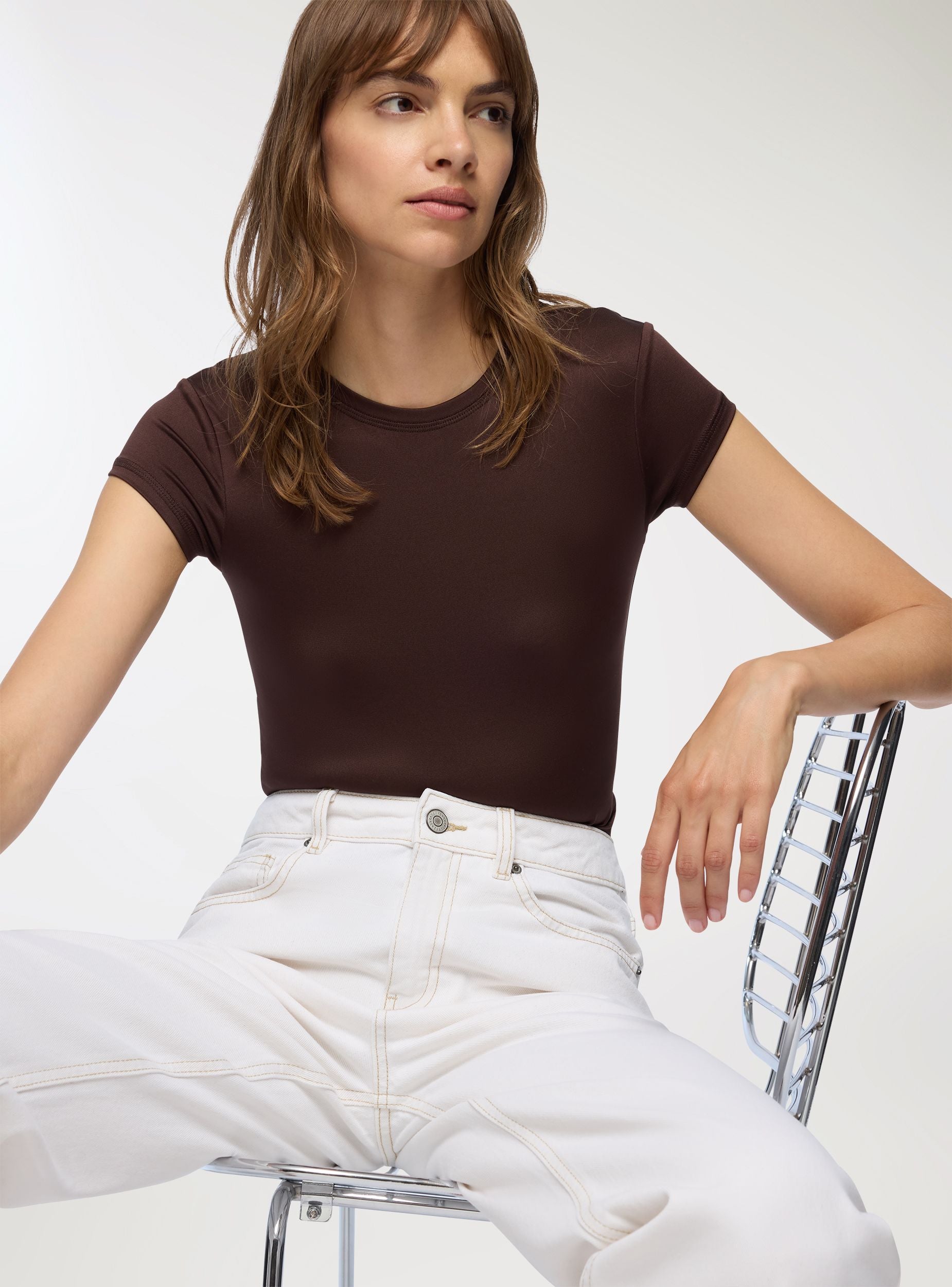 T-shirt femme unie, confectionnée en tissu extensible, idéale pour un look décontracté et polyvalent. Elle présente une coupe régulière avec des manches courtes et un col rond, parfaite à associer avec un jean ou un pantalon pour une tenue quotidienne. Adaptée à diverses occasions, des loisirs aux sorties informelles, elle garantit confort et style en toute circonstance.Détails