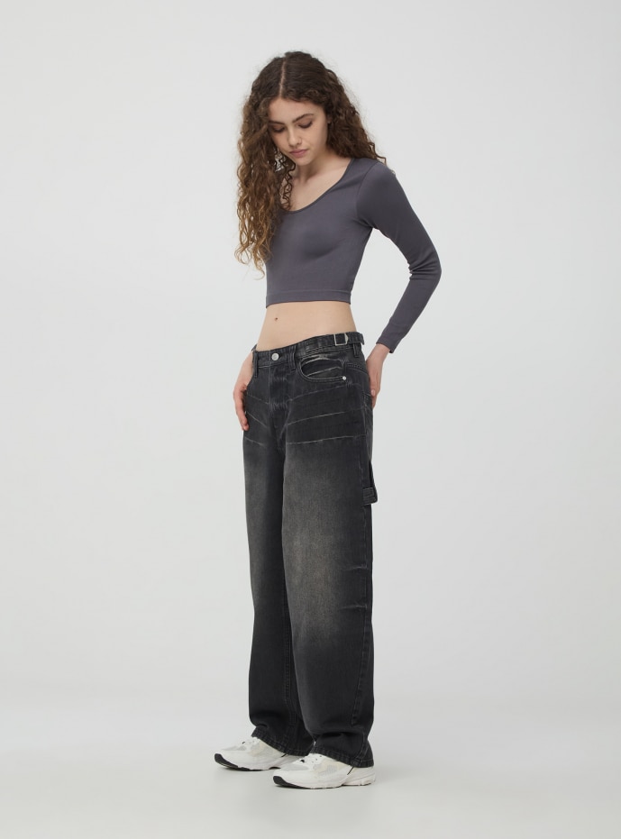 Jeans carpenter balloon pour femme caractérisés par une silhouette large et confortable, parfaite pour un look décontracté et relaxé. Réalisés en denim noir. Modèle avec passants à la taille et fermeture avec bouton et zip. Jeans modèle carpenter caractérisé par des poches et un anneau latéraux. Les poches arrière sont spacieuses et fonctionnelles, tandis que les poches avant inclinées ajoutent une touche de praticité. La jambe large se rétrécit légèrement vers le bas, créant un effet balloon qui apporte mouvement et originalité au vêtement. Ces jeans sont parfaits à associer avec des t-shirts décontractés ou des pulls oversize et des sneakers pour un look urbain et tendance.