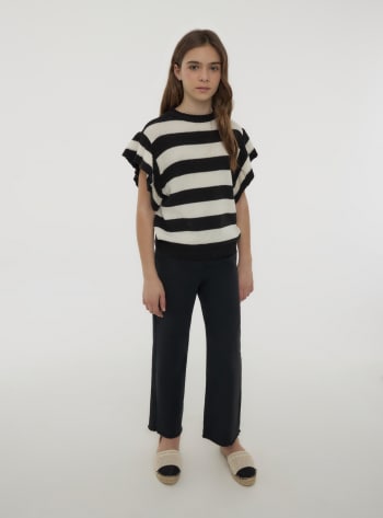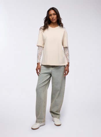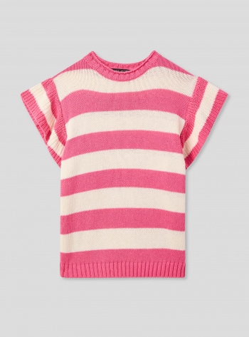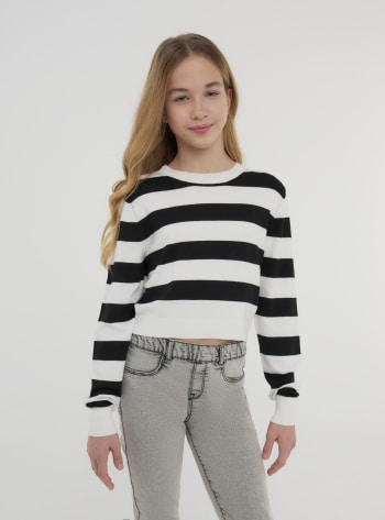 Pull femme au style superposé, conçu pour celles qui aiment se démarquer avec originalité. Le design associe un corsage en maille avec un effet rayé en contraste, superposé à des manches longues à coupe ample et droite. Le résultat est un mélange visuel de textures et de volumes qui donne au vêtement un look moderne et dynamique. Parfait avec un jean taille haute ou un pantalon cargo pour une tenue décontractée mais soignée, ou par-dessus une jupe en denim pour un contraste jeune et audacieux. Idéal pour les mi-saisons.