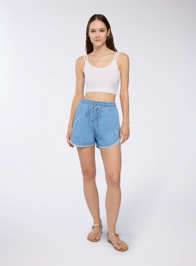 Shorts pour femmes au style décontracté, idéaux pour les journées d'été et de détente. Ils disposent d'un cordon de serrage à la taille pour un ajustement confortable et réglable. Le design comprend des détails effilochés le long des bords, ajoutant une touche moderne et dynamique. Parfaits à associer avec des t-shirts légers et des sandales pour un look frais et informel.
