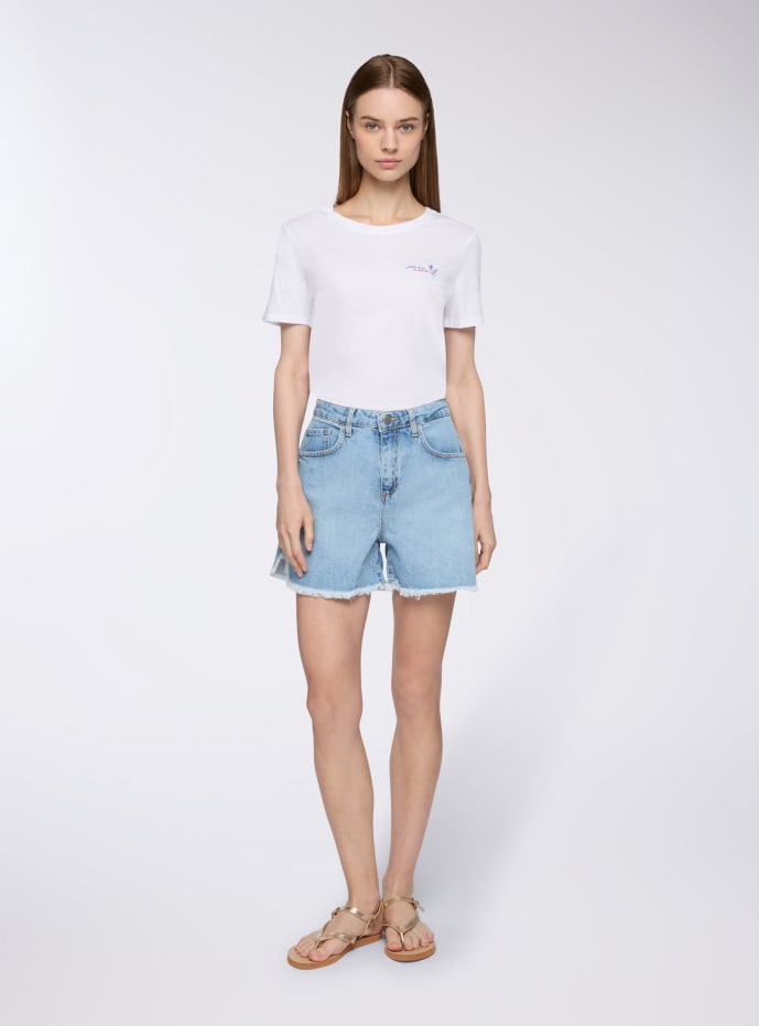 Shorts en denim pour femme avec fentes latérales. Idéaux pour un look décontracté et moderne, ces shorts offrent une coupe confortable et des détails de design tels que l'ourlet effiloché et les poches fonctionnelles. Parfaits à assortir avec des t-shirts et des baskets, ils sont un vêtement polyvalent pour la saison estivale.