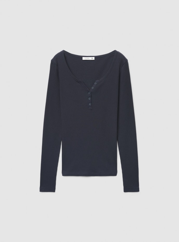 T-shirt femme à manches longues avec encolure américaine et patte de boutonnage courte sur le devant. Modèle uni, coupe régulière et ligne épurée qui suit la silhouette sans serrer. Parfaite à porter avec un jean et des baskets pour les loisirs ou sous un cardigan et une veste pour un look en superposition. Un vêtement polyvalent pour tous les jours.