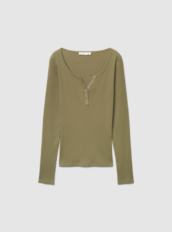 T-shirt femme à manches longues avec col rond à boutonnière courte sur le devant. Modèle uni, coupe régulière et ligne épurée qui suit la silhouette sans serrer. Parfaite à porter avec un jean et des baskets pour les loisirs ou sous un cardigan et des vestes pour un look en couches. Vêtement polyvalent pour tous les jours.