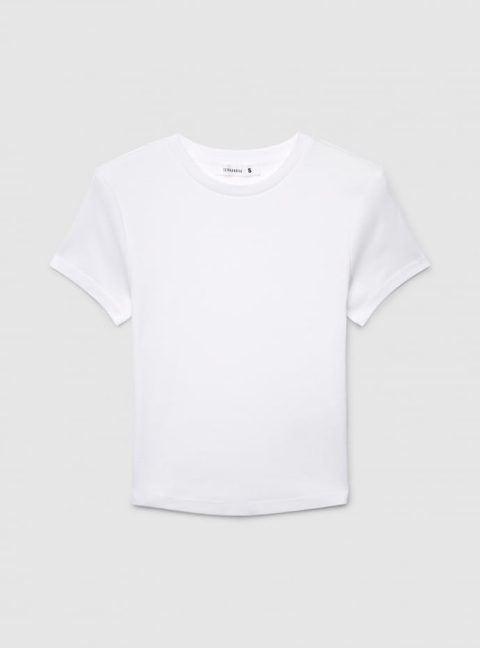 T-shirt femme unie avec une coupe courte. Col rond et manches courtes, design épuré parfait pour un look quotidien. À porter avec un jean taille haute, des jupes midi ou sous une chemise ouverte pour une touche moderne. Design simple avec des finitions minimalistes qui mettent en valeur la silhouette. Polyvalente pour les loisirs, à associer avec des baskets ou des bottines pour un look décontracté et tendance.