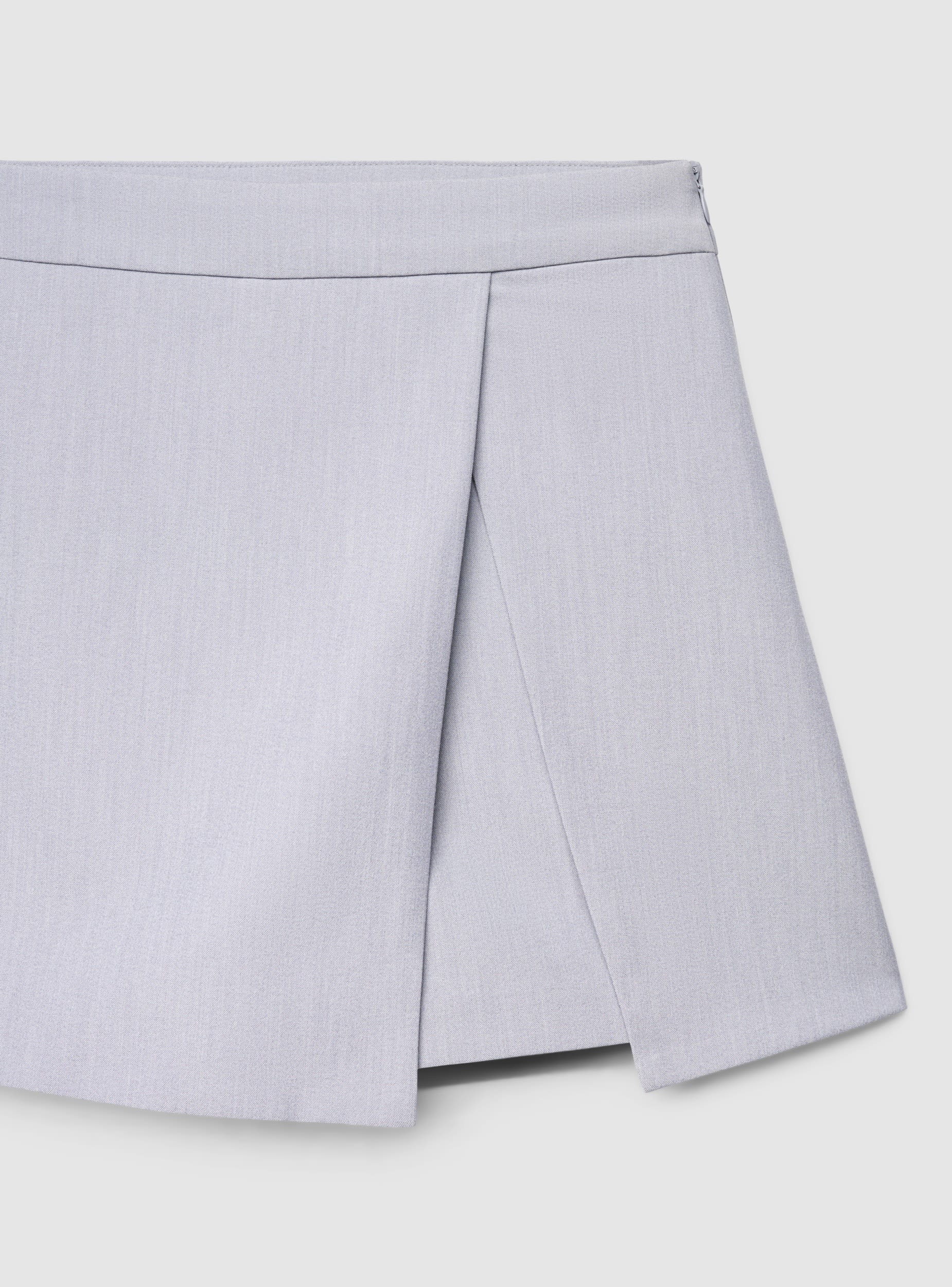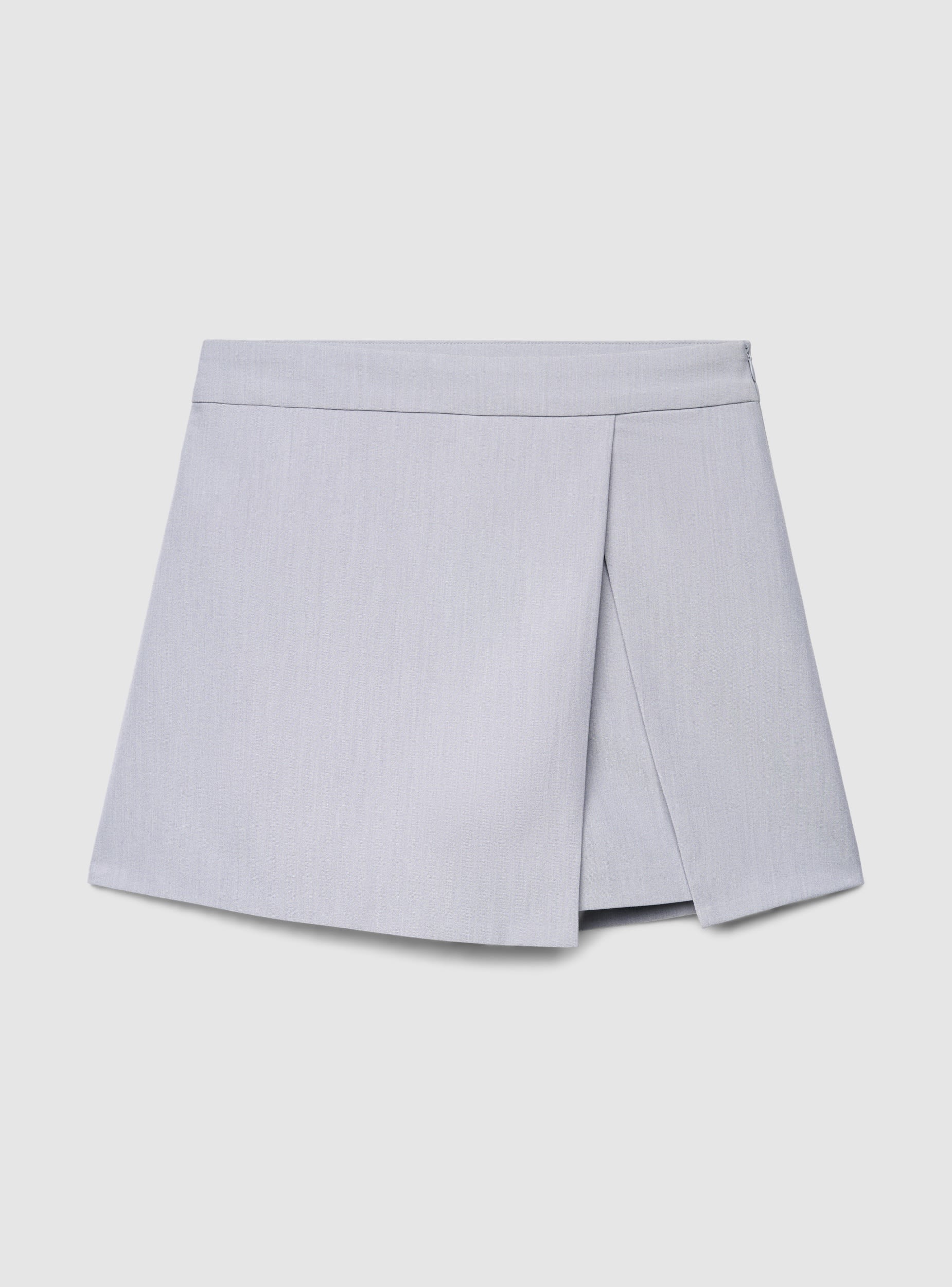 Kratke hlače-suknja za žene s omotavajućim i asimetričnim dizajnom, s kratkom linijom i strukturom koja spaja praktičnost kratkih hlača s efektom suknje. Visoki struk s čistim remenom i bočnim zatvaračem. Melange uzorak čini je lako kombiniranom s košuljama, blejzerima ili majicama za uredske i ležerne izglede, također u kombinaciji s tenisicama ili salonkama.Detalji