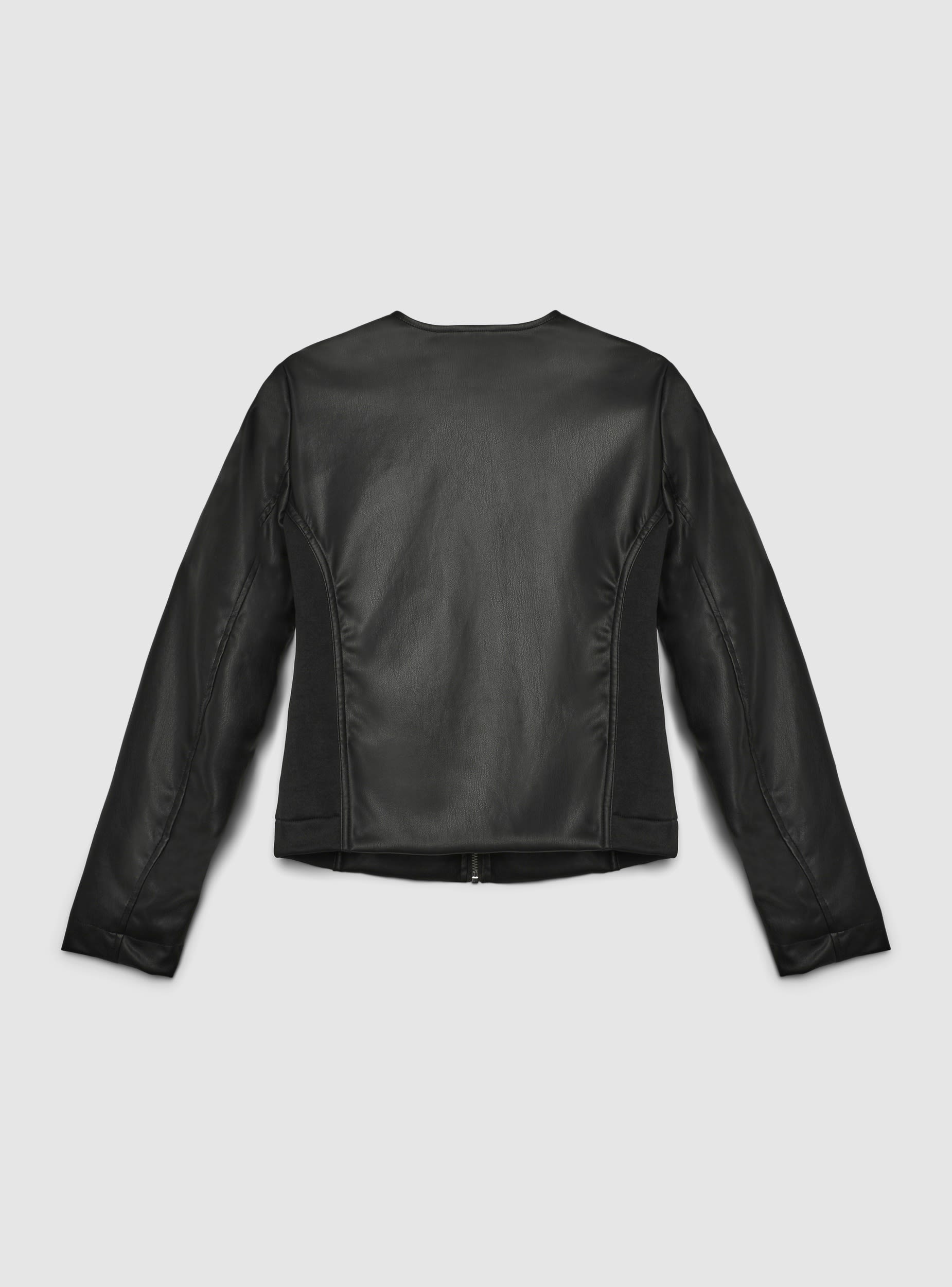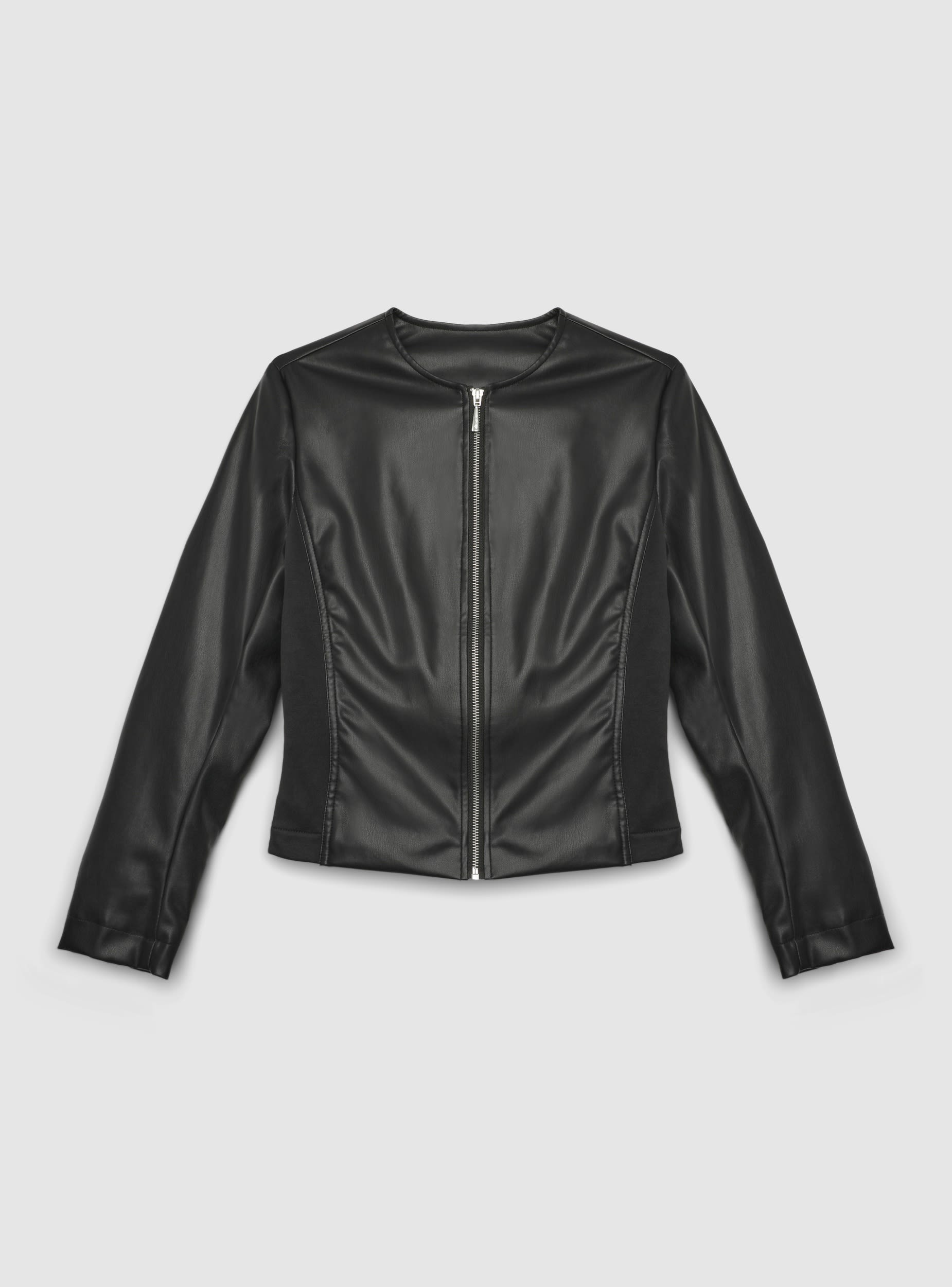 Ženska biker jakna s patentnim zatvaračem i okruglim ovratnikom. Tkanina od jednobojne umjetne kože. Dugih rukava i regularnog kroja, idealna uz traperice i čizme ili preko midi haljina za odvažan izgled u večernjim izlascima i slobodno vrijeme. Savršena kao lagani gornji sloj za prijelazno razdoblje.Detalji