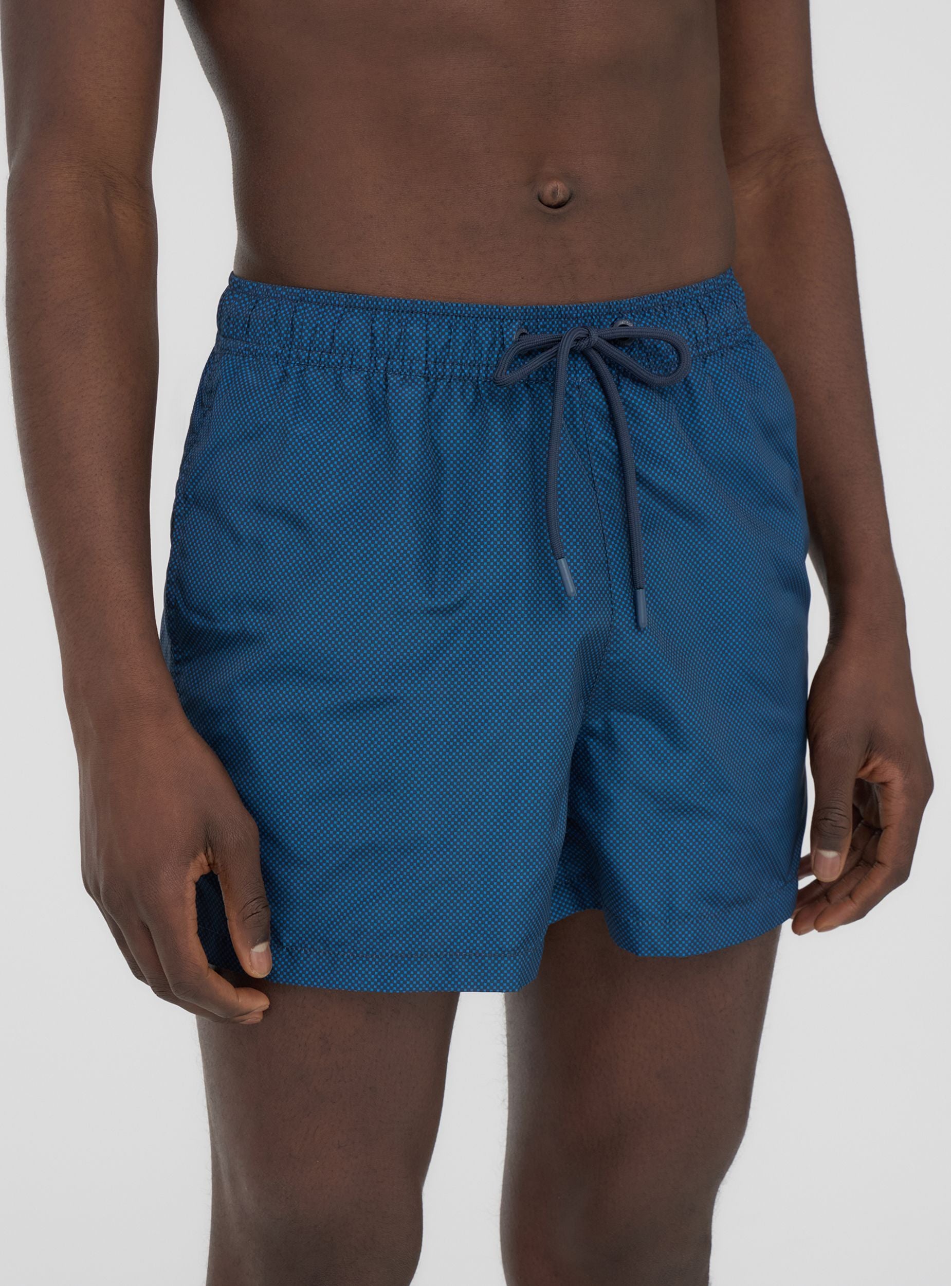 Muški kupaći kostim u bermuda stilu s podesivom vezicom, savršen za more i dane uz bazen. Mikro geometrijski uzorak dodaje dašak osobnosti, čineći ga idealnim za kombiniranje s laganim majicama ili lanenim košuljama. Opremljen praktičnim bočnim džepovima i stražnjim džepom s čičak zatvaranjem, nudi udobnost i funkcionalnost. Neophodan komad za dotjeran i svestran ljetni izgled.Detalji