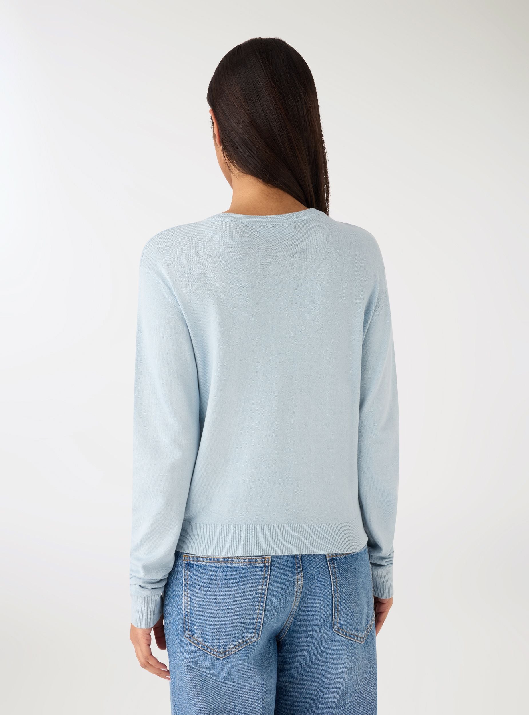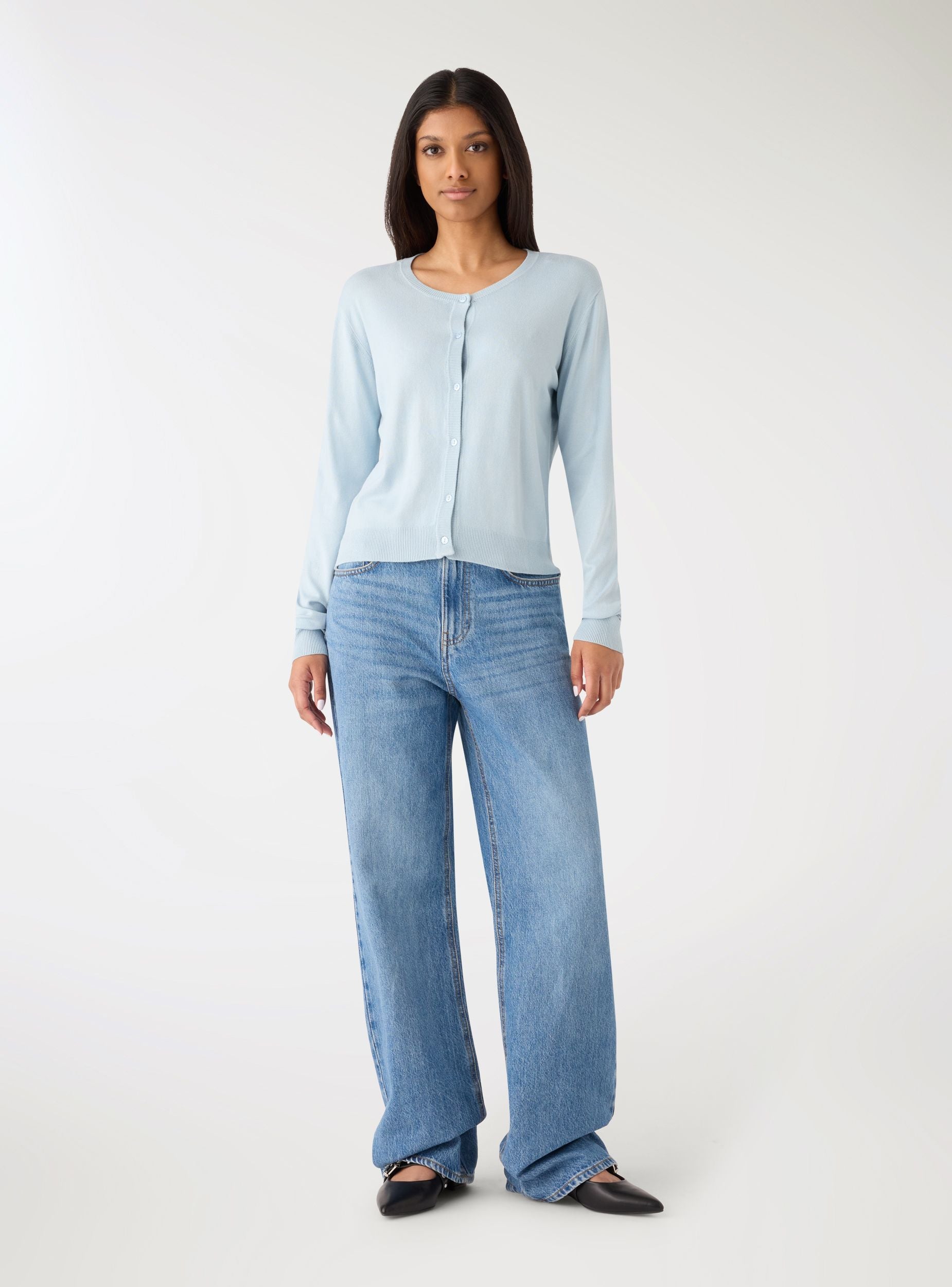 Ženska majica model kardigan u jednobojnoj varijanti, idealna za nošenje preko topova i haljina za uredski ili ležerni izgled. Okrugli izrez i prednje kopčanje na gumbe, dugi rukavi i rebrasti završeci na izrezima, manžetama i rubu za uredan kroj. Savršena uz traperice, krojene hlače ili suknje visokog struka.Detalji