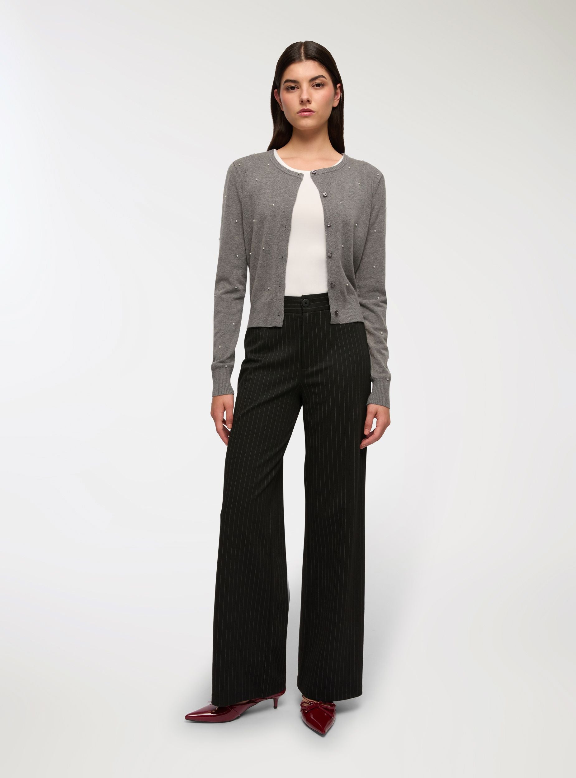 Ženski kardigan s elegantnim i svestranim dizajnom. Ovaj kardigan ima kopčanje na gumbe i ukrasne detalje s perlama, koji dodaju profinjen dodir. Idealan je za upotpunjavanje casual ili formalnih outfita, savršeno se slaže s hlačama ili suknjama. Udoban kroj i jednostavan dizajn čine ga nezaobilaznim komadom u ormaru.Detalji