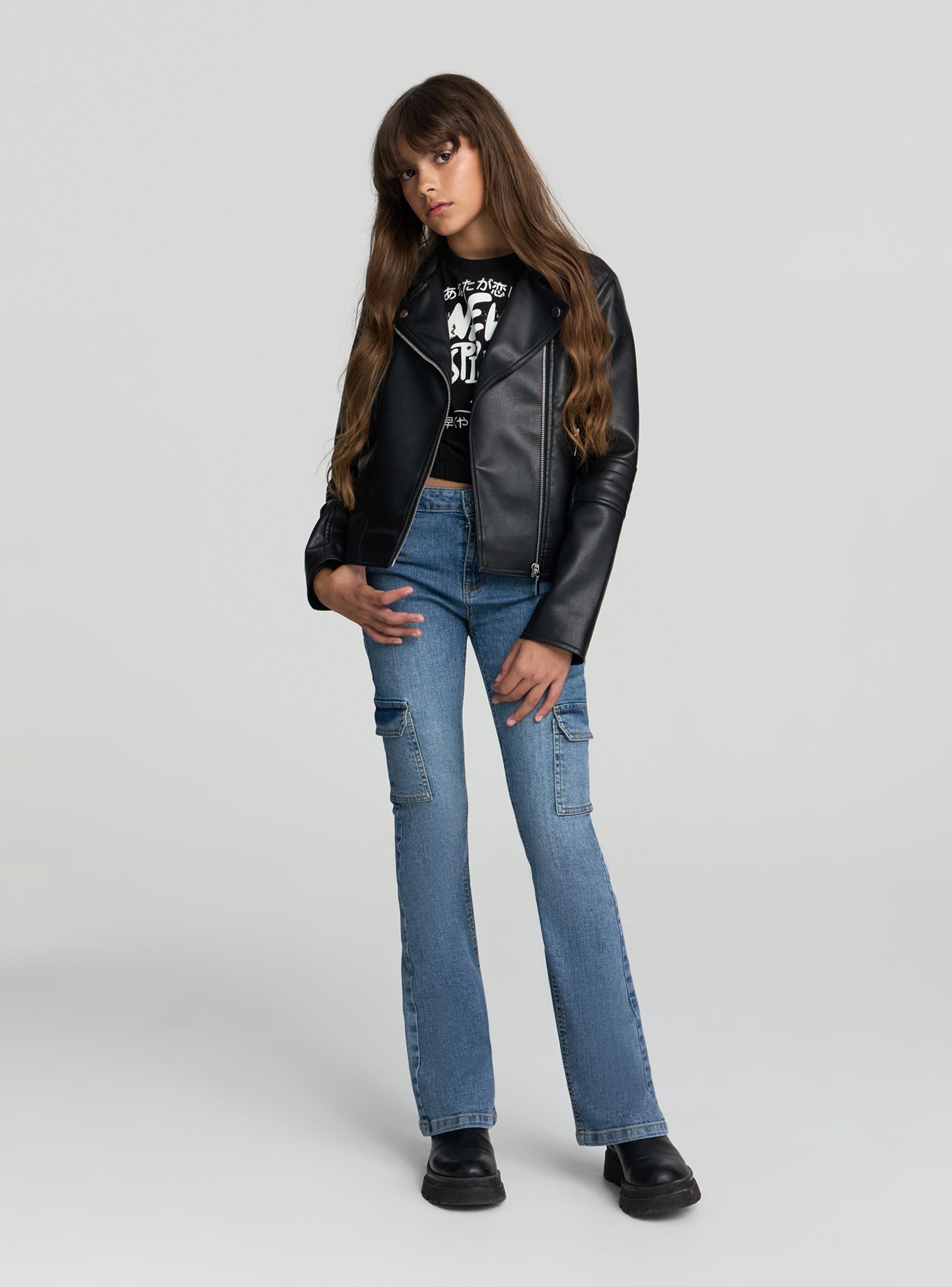 Jakna od umjetne kože za djevojčice, savršena za energične i svestrane lookove, idealna za prijelazno razdoblje. Ima klasičan ovratnik, duge rukave i asimetrično zatvaranje na patentni zatvarač. Opremljena je džepovima sa zatvaračem i detaljima od prošivene tkanine na rukavima, lako se kombinira s trapericama ili haljinama za ležeran ili sofisticiraniji outfit. Regularna kroja, savršena za svaku urbanističku priliku.Detalji
