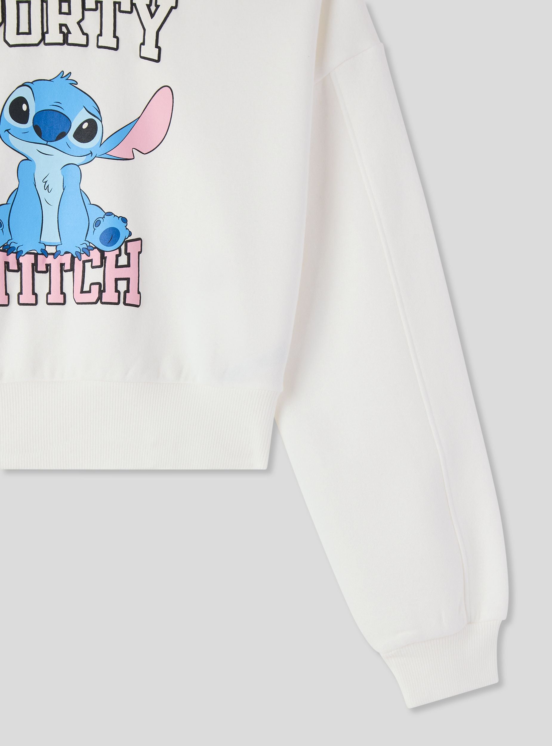 Dječja crop dukserica u jednobojnoj boji, idealna za slobodno vrijeme i neformalne dane. Dizajn uključuje prednji print sa Stitch® i natpisom, model s okruglim izrezom bez kapuljače, te bez zatvarača s dugim rukavima. Kratka silueta čini je savršenom za kombiniranje s trapericama ili hlačama viskog struka. Rukavi i donji rub s rebrastim završetkom dodaju udobnost i praktičnost, dok se svestran stil prilagođava različitim prilikama.Detalji