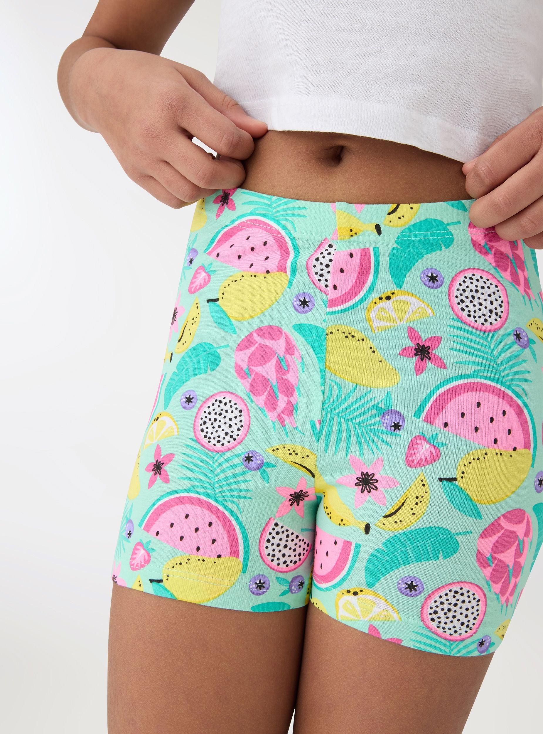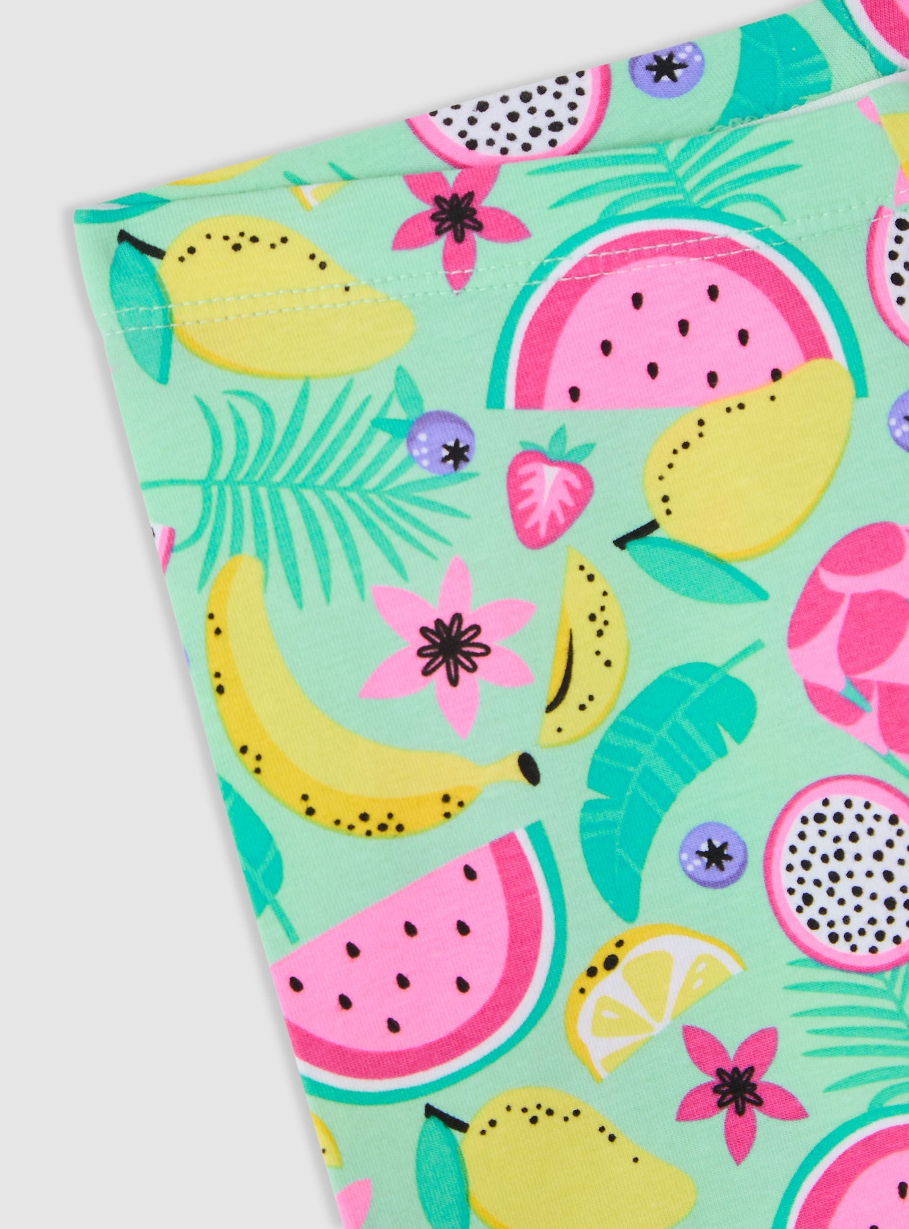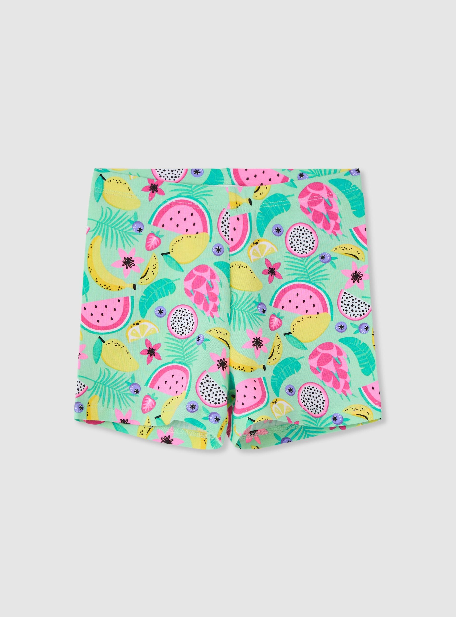 Kratke helanke za djevojčice s uzorkom voća po cijeloj površini, idealne za ljetne kombinacije i dane igre. Uski kroj s elastičnim pojasom za udobno i stabilno pristajanje. Biciklistički stil s kratkim nogavicama i urednim šavovima, lako se kombiniraju s majicama, topovima i laganim duksericama za školu, slobodno vrijeme i praznike.Detalji