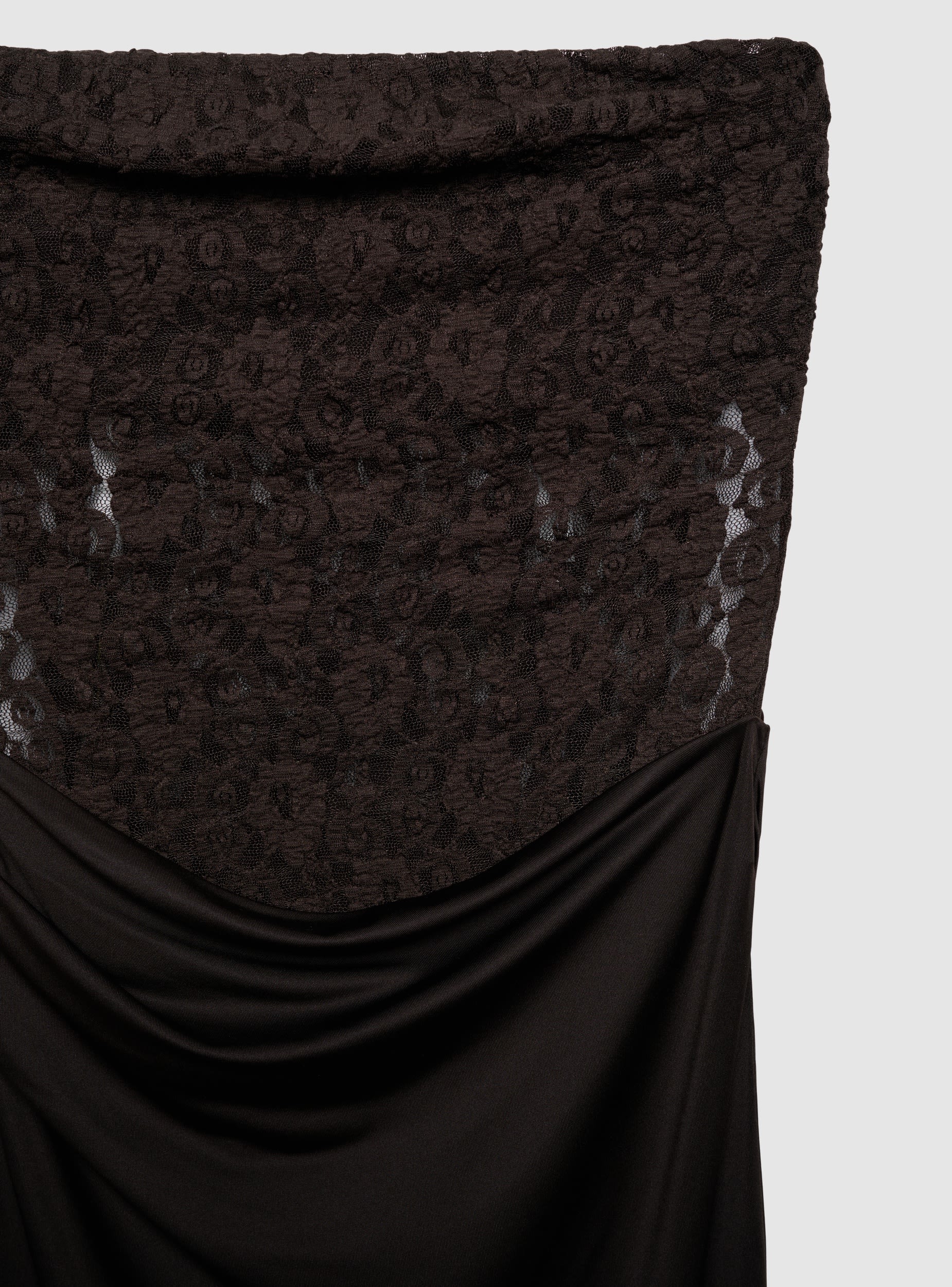 Duga ženska haljina na bretele, dizajnirana za večernje izlaske i događaje. Korzet od čipke s cvjetnim uzorkom naglašava figuru, dok suknja s naborima sprijeda daje pokret. Model bez rukava i bez naramenica, jednostavan za kombiniranje sa sandalama s ukrasima i blejzerom za profinjen izgled.Detalji