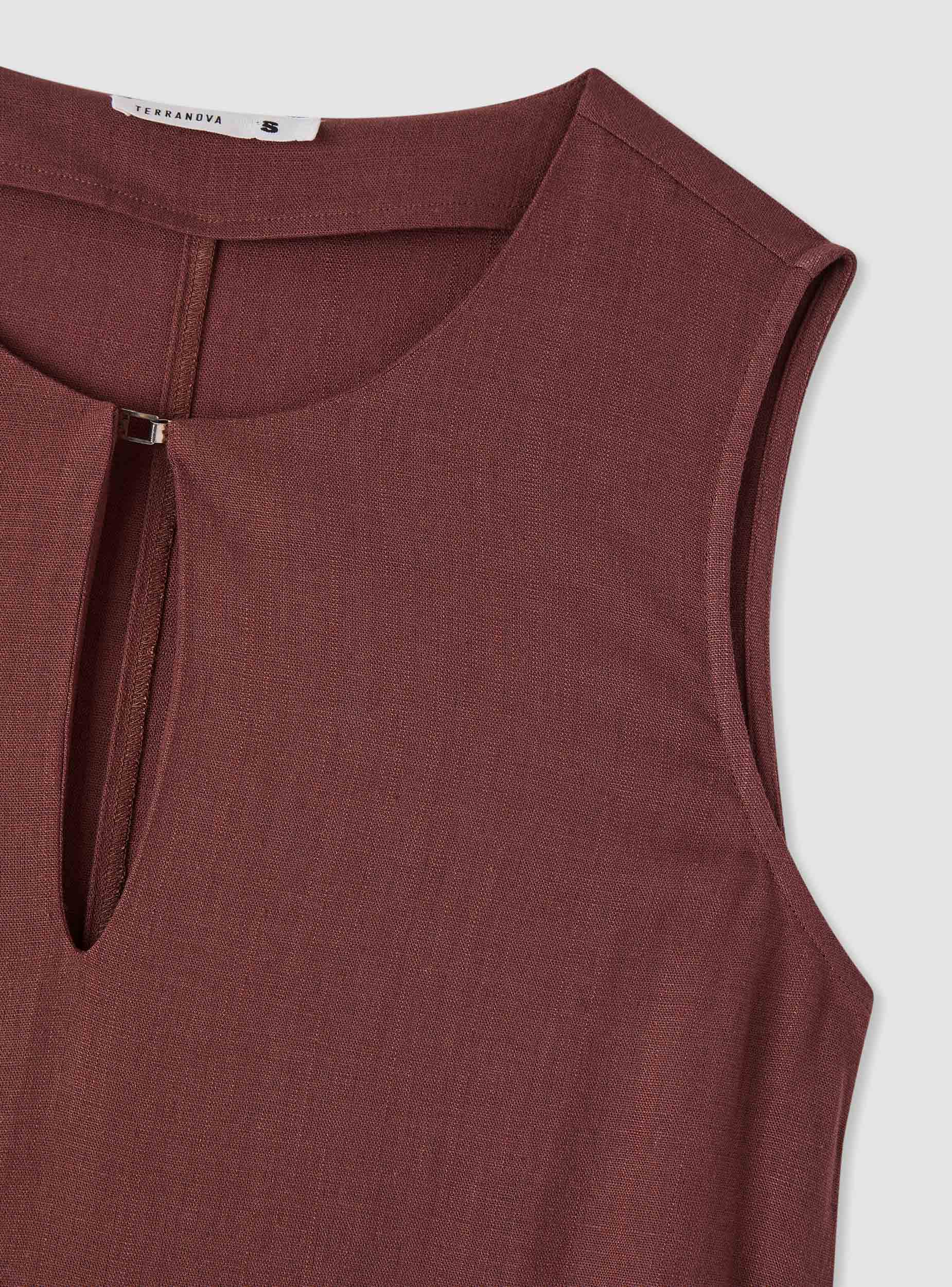 Ženska haljina jednobojna, duga i bez rukava, s okruglim izrezom ukrašenim otvorom u obliku kapljice s malim metalnim detaljem. Fluidan i udoban kroj, idealan za ljetne dane ili ležerne večeri. Upari se s ravnim sandalama ili platformama i torbom preko ramena za dotjeran izgled. Tkanina s efektom lana.Detalji